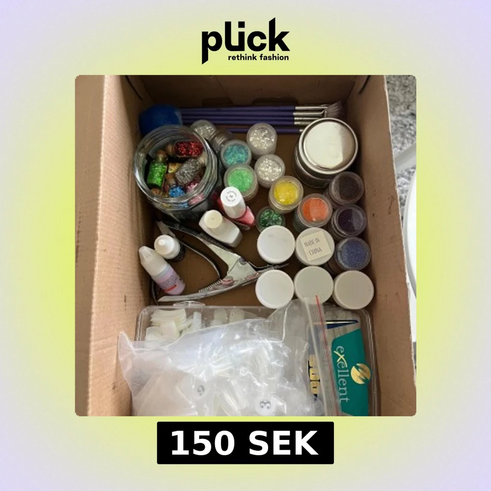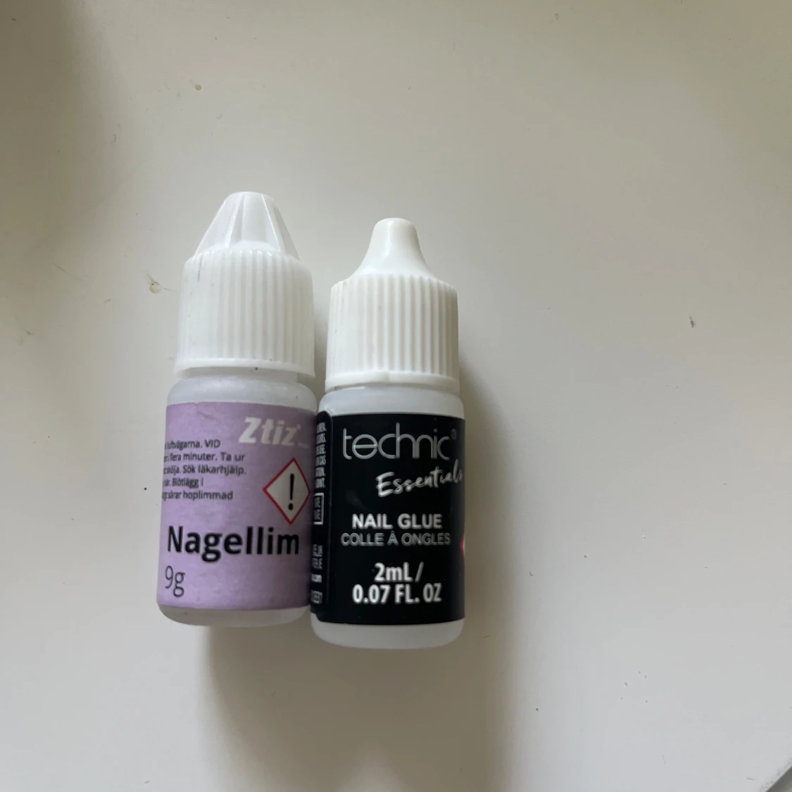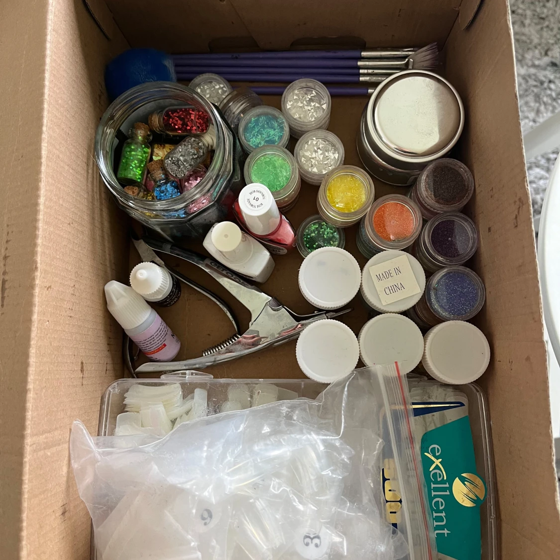 Nagelkit med två nagellack (brun Gelook och rosa Maybelline Super Stay), nagellim från Technic och Ztiz, flera burkar med glitter i olika färger, penslar med lila skaft, blå fluffborste och metallverktyg för naglar. Perfekt för dig som älskar att fixa naglarna och vill ha många valmöjligheter.