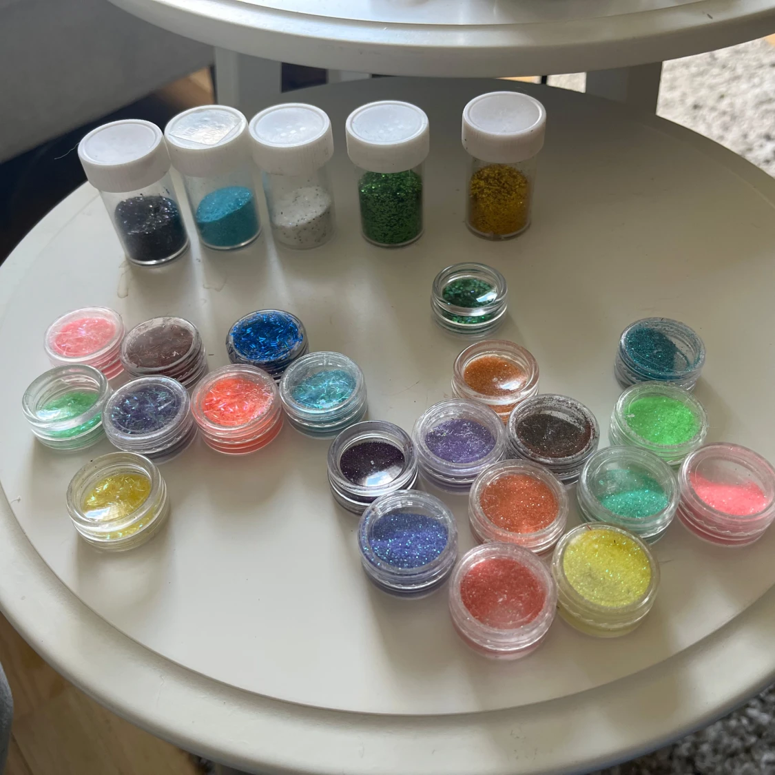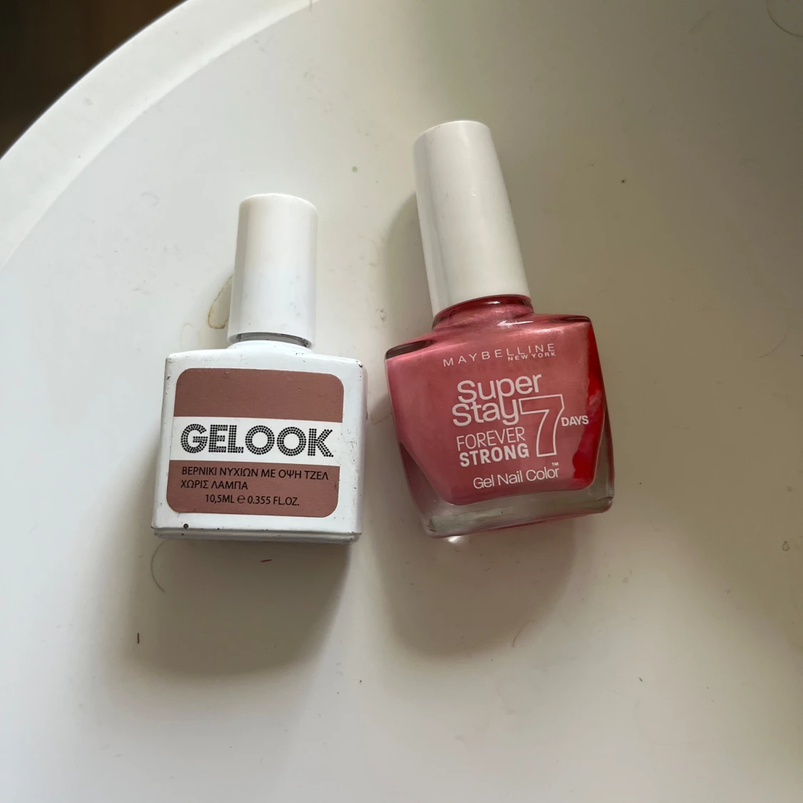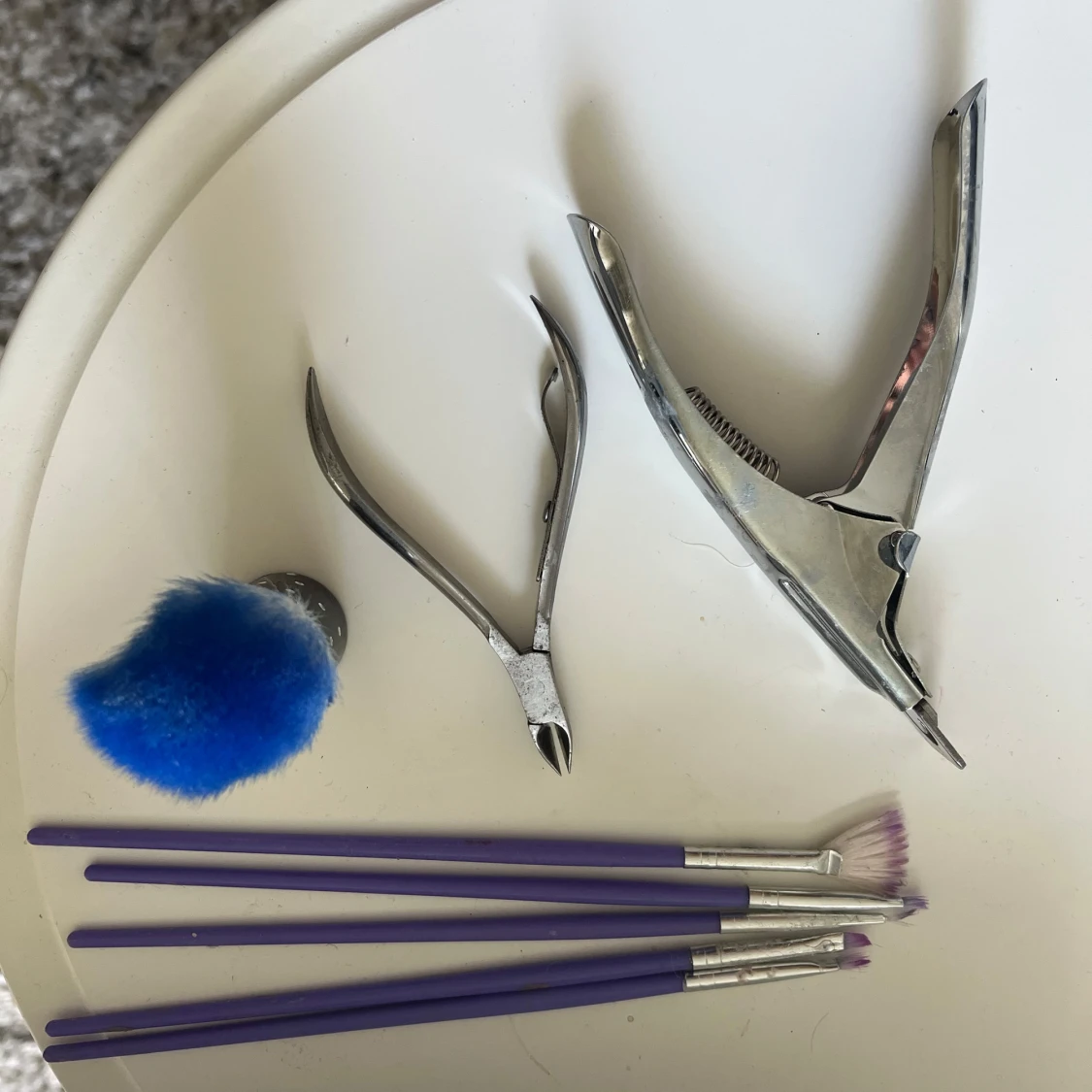 Nagelkit med två nagellack (brun Gelook och rosa Maybelline Super Stay), nagellim från Technic och Ztiz, flera burkar med glitter i olika färger, penslar med lila skaft, blå fluffborste och metallverktyg för naglar. Perfekt för dig som älskar att fixa naglarna och vill ha många valmöjligheter.