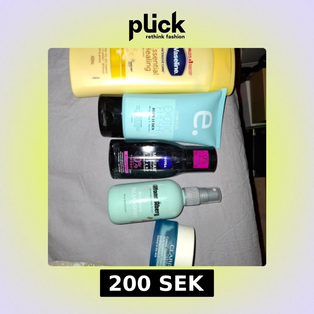 Samling av hudvårdsprodukter inklusive Vaseline Essential Healing lotion, e. Essentials Exotic body lotion, Nivea micellärt vatten, Balsamspray Alfons Åberg Clarins ansiktskräm, Cetaphil ansiktslotion och Human+Kind kroppsolja med lavendel. Det är hälften kvar minst i Clarins och resten är fulla eller snudd på!