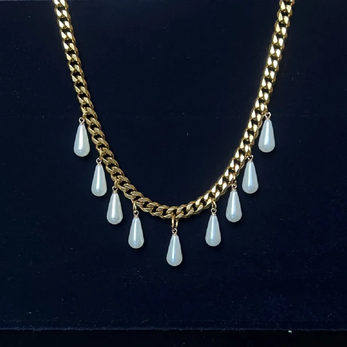 Säljer ett guldhalsband med hängande pärlor, kedjan är från Edblad så den är i bra kvalitet. Nypris = 700kr💕