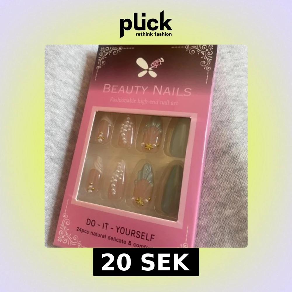 Snygga konstgjorda naglar i 24-pack med nude och ljusblåa detaljer, med pärlor och små guldfärgade stjärnor. Naglarna har en elegant, mandelformad design och kommer i en rosa förpackning. De är aldrig använda, de ingår med press on stickers som man kan välja att sätta på eller lim samt med en liten fil.