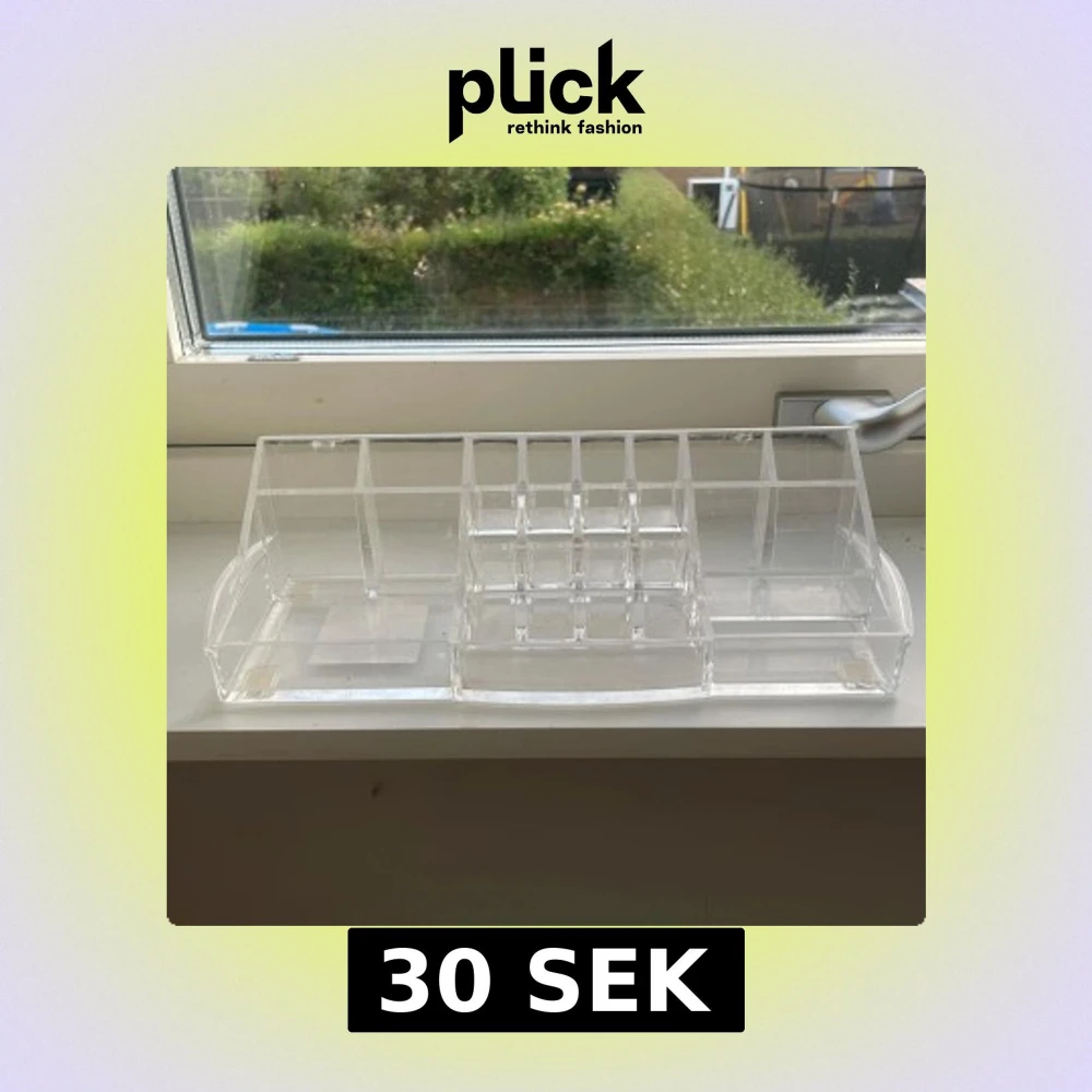 Snygg och praktisk sminkförvaring i genomskinlig akryl med flera fack i olika storlekar. Perfekt för att organisera läppstift, borstar, ögonskuggor och andra sminkprodukter på sminkbordet eller i badrummet.