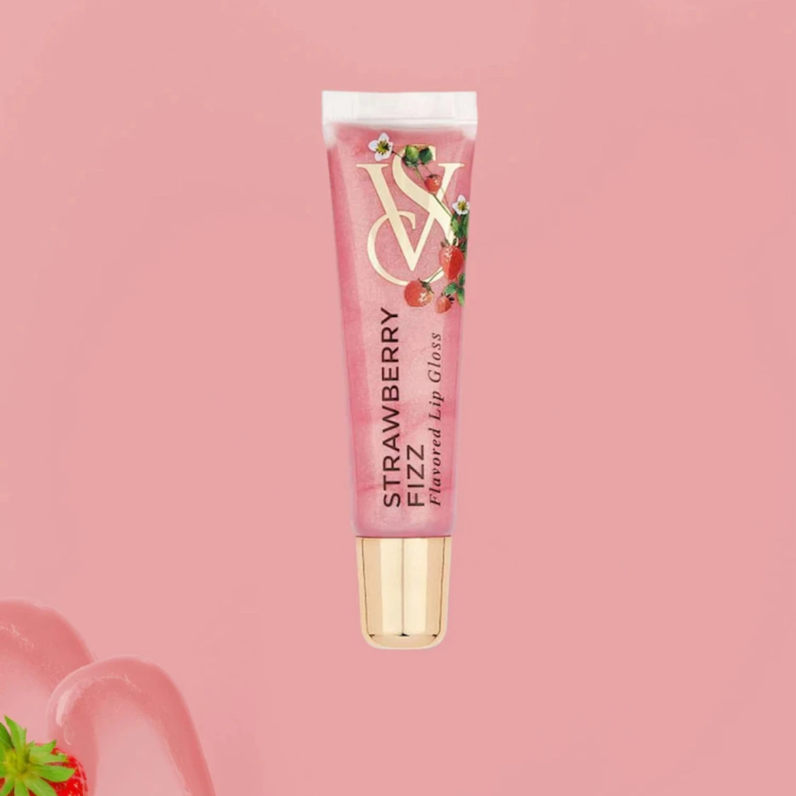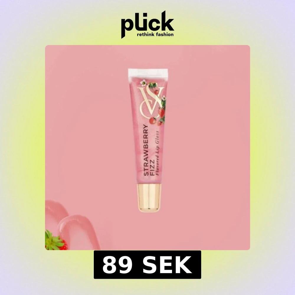 Glansigt rosa läppglans med jordgubbssmak från Victoria's Secret. Tuben har guldfärgat lock och dekorativa jordgubbar på framsidan. Perfekt för dig som vill ha en söt och fräsch finish på läpparna.