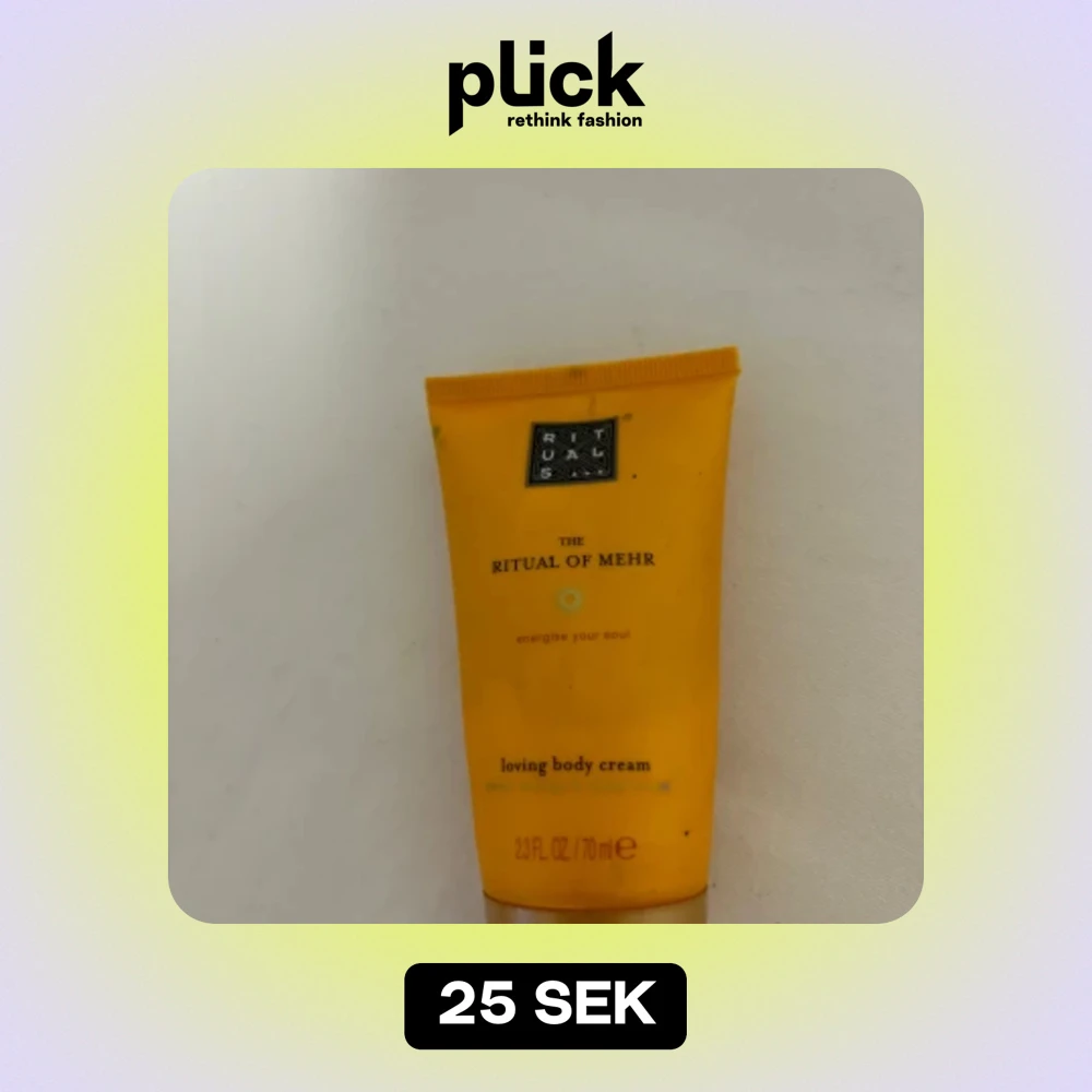 Säljer en härlig body cream från Rituals, The Ritual of Mehr. Denna kroppskräm är perfekt för att ge din hud en energikick och lämnar den mjuk och återfuktad. Tuben innehåller 70 ml och är i en fin orange färg. Perfekt att ha med sig i väskan för att hålla huden fräsch hela dagen! halva är kvar men om du köper hemsprayen i min profil så kan du få båda för 130