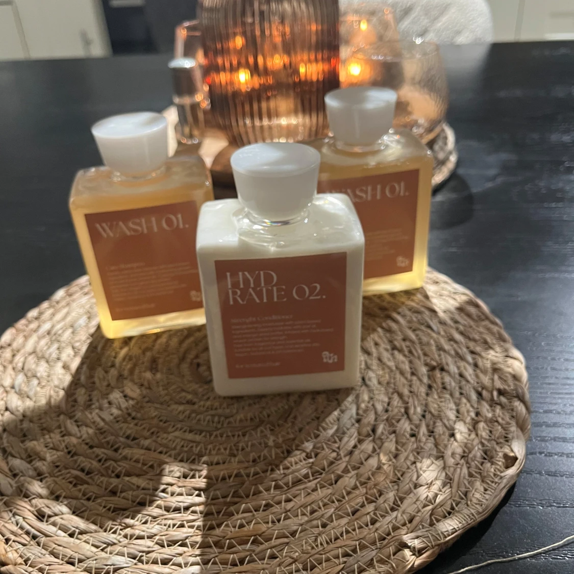 Säljer Wash 01 schampo och Hydrate 02 balsam från For Some/One. Sulfatfritt, veganskt och parfymfritt, perfekt för känslig hårbotten och lockigt hår. Kommer i snygga fyrkantiga plastflaskor med vita lock och beige etiketter. Passar alla hårtyper, även barn från 3 år.alla 3 för 500 annars kostar en strax över 300