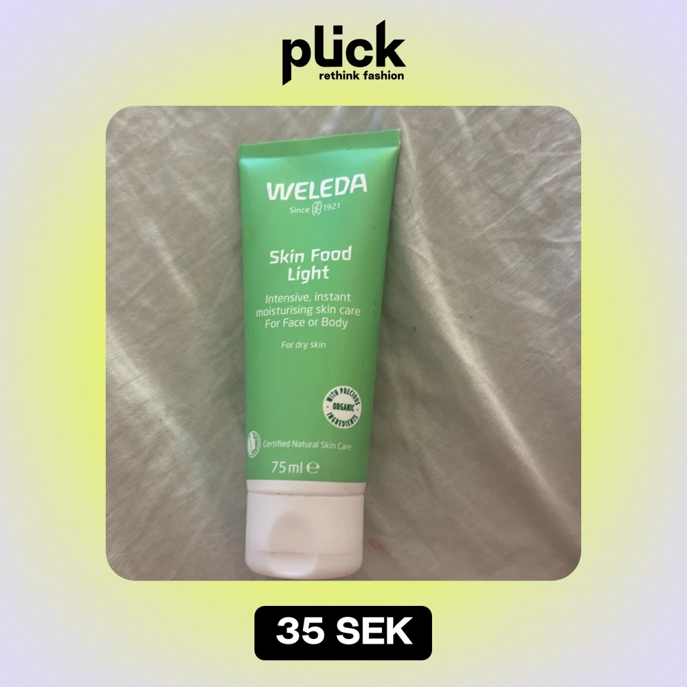 Säljer en 75 ml tub av Weleda Skin Food Light. Perfekt för torr hud, denna kräm ger intensiv och omedelbar återfuktning för både ansikte och kropp. Certifierad naturlig hudvård, idealisk för daglig användning. Nästintill helt full, minst 3/4 kvar