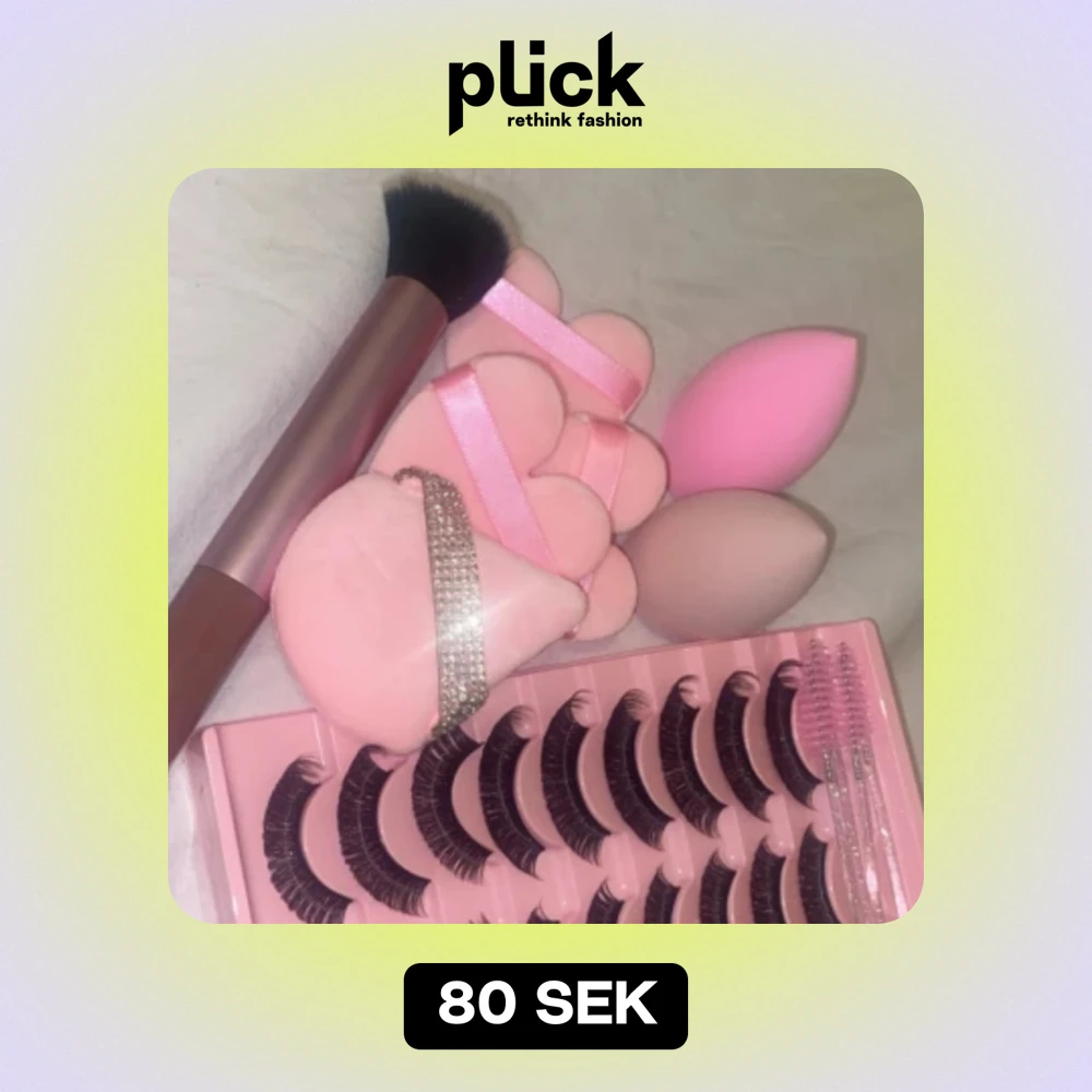 2 beauty blenders. 1 smink borste. 3 hjärtformade puderpuffar. 1 triangelformad puderpuff. Lösögonfransar 9 st (par). 4 fransborstar. (Från Shein) 80kr.