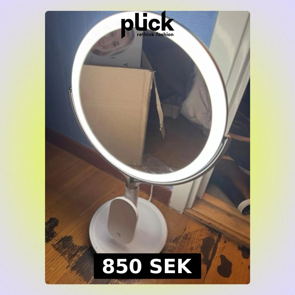 Snygg rund sminkspegel med inbyggd LED-belysning och trådlös laddare. Spegeln är ca 8 tum och har en modern vit design med stabil fot. Perfekt för sminkning och hudvård, och LED-ringen ger jämnt ljus. Passar perfekt på sminkbordet eller i badrummet.