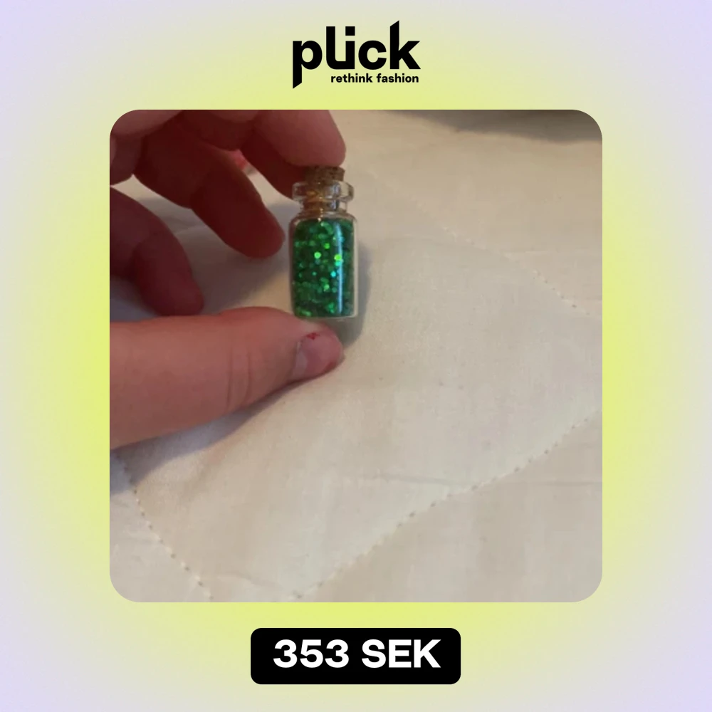En liten glasflaska fylld med grönt glitter. Flaskan har en kork som förslutning och är perfekt för dekorativa ändamål eller pyssel.
