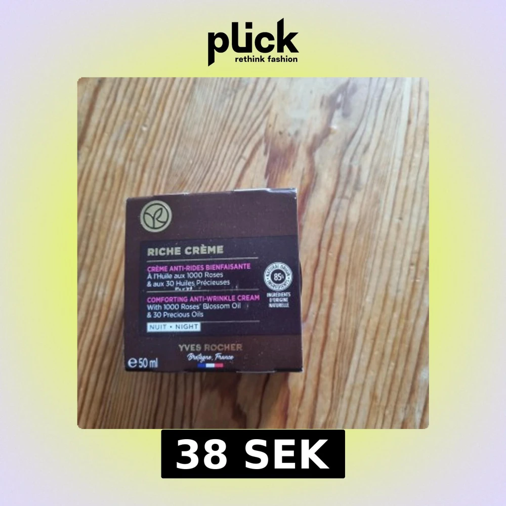 Riche Crème nattkräm från Yves Rocher med olja från 1000 rosor och 30 exklusiva oljor. Kommer i en brun förpackning, 50 ml. Innehåller 85% ingredienser av naturligt ursprung. Perfekt för dig som vill ha extra näring och mjukhet på natten.