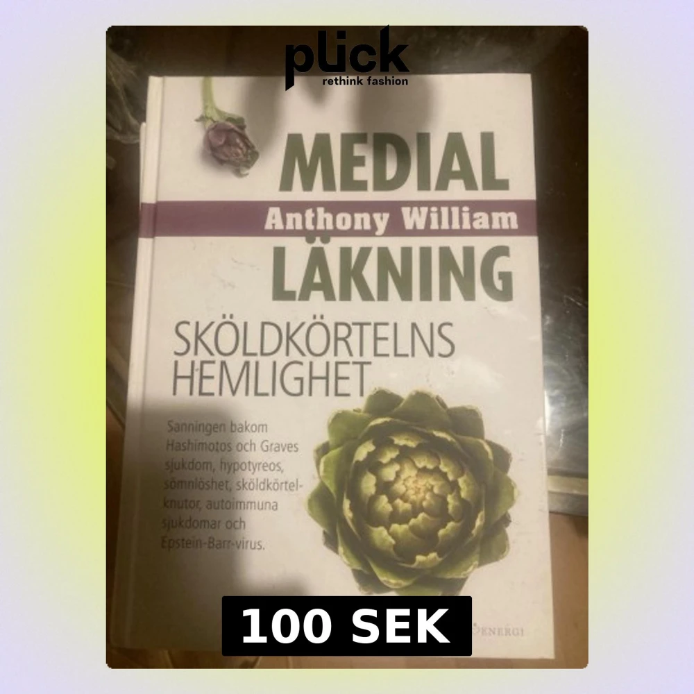 Boken 'Medial Läkning: Sköldkörtelns Hemlighet' av Anthony William utforskar sköldkörtelns roll i hälsa och sjukdomar. Omslaget är vitt med gröna och lila detaljer samt bilder på kronärtskocka och blomma. Inbunden bok, svensk text.