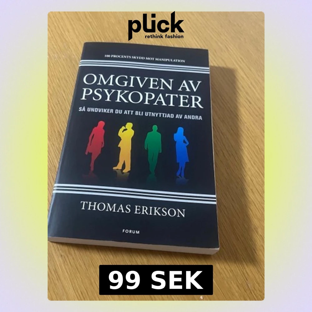Omgiven av psykopater av Thomas Erikson är en svart pocketbok med färgglada siluetter på framsidan. Boken handlar om hur du undviker att bli utnyttjad av andra och ger verktyg för att identifiera manipulativa personer i din närhet.