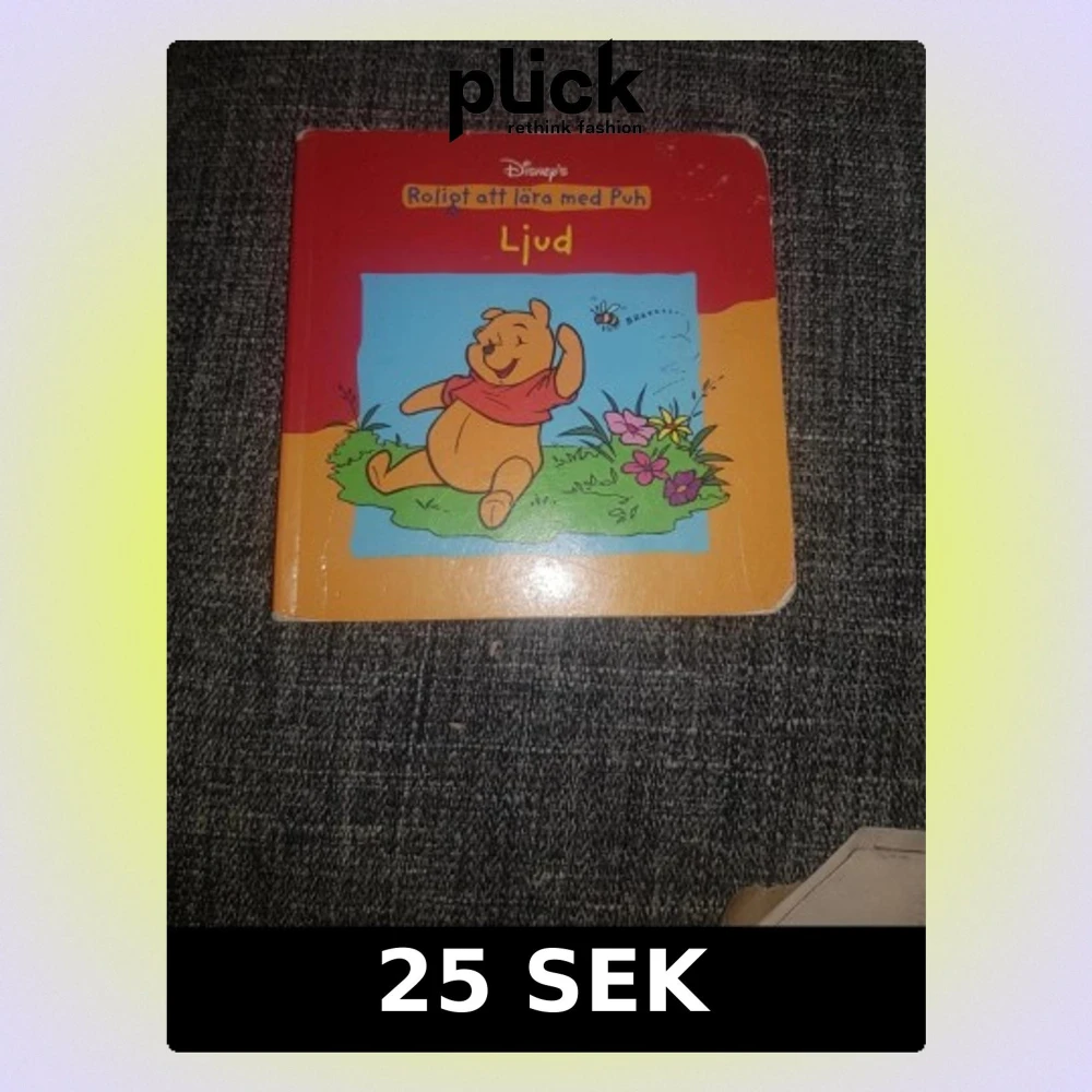 Barnbok med Nalle Puh på omslaget, färgglad med röd, orange och blå framsida. Boken heter 'Roligt att lära med Puh: Ljud' och har en illustration av Puh som ligger på gräset bland blommor. Perfekt för dig som gillar klassiska Disney-karaktärer.