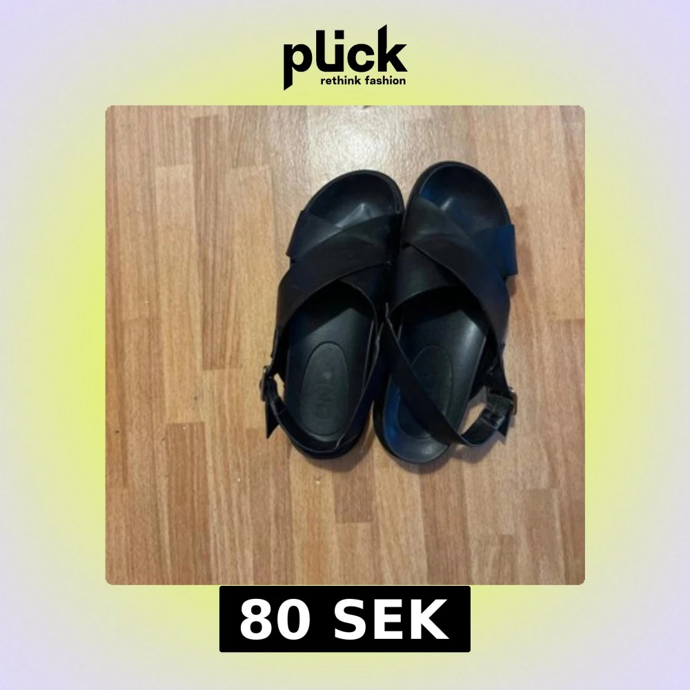 Säljer ett par svarta sandaler med breda korsade remmar och justerbart spänne vid hälen. Skorna har en platt sula och är tillverkade i syntetmaterial. Perfekta för varma dagar och enkel att matcha med olika outfits.