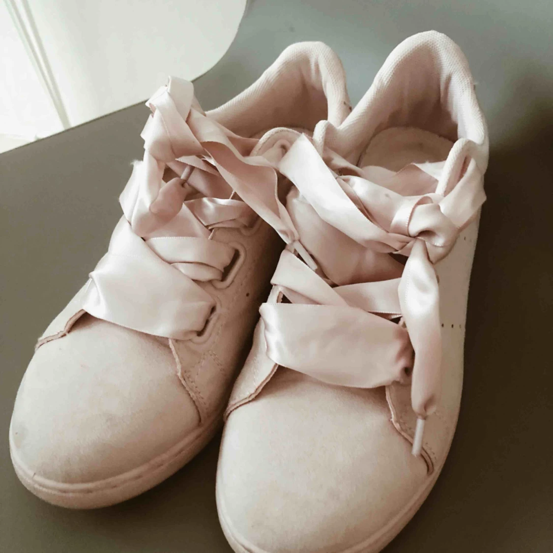 Ljusrosa Sneakers i mockaimitation med breda sidensnören. Använda 5 gånger. Storlek 40 men är små i storlek, är som 39or. Ordpris 500kr! Frakt tillkommer 50kr🙏🏼