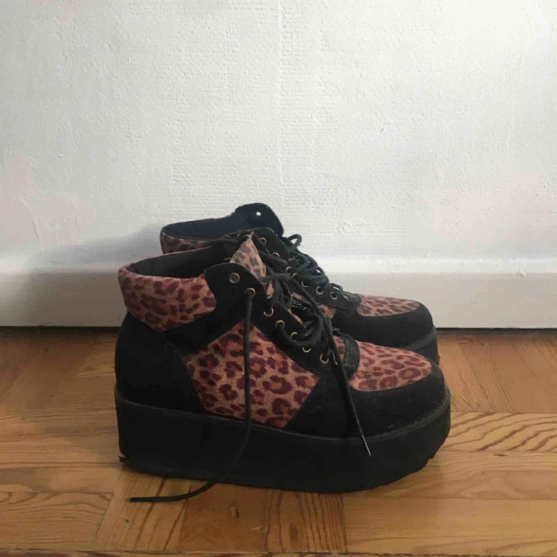 Platåskor i leopardmönster köpta på skoaffären Zoe, vet inte märket dock. Ca 5 cm platå Färgen på skorna har tyvärr blivit solblekt på vissa ställen.