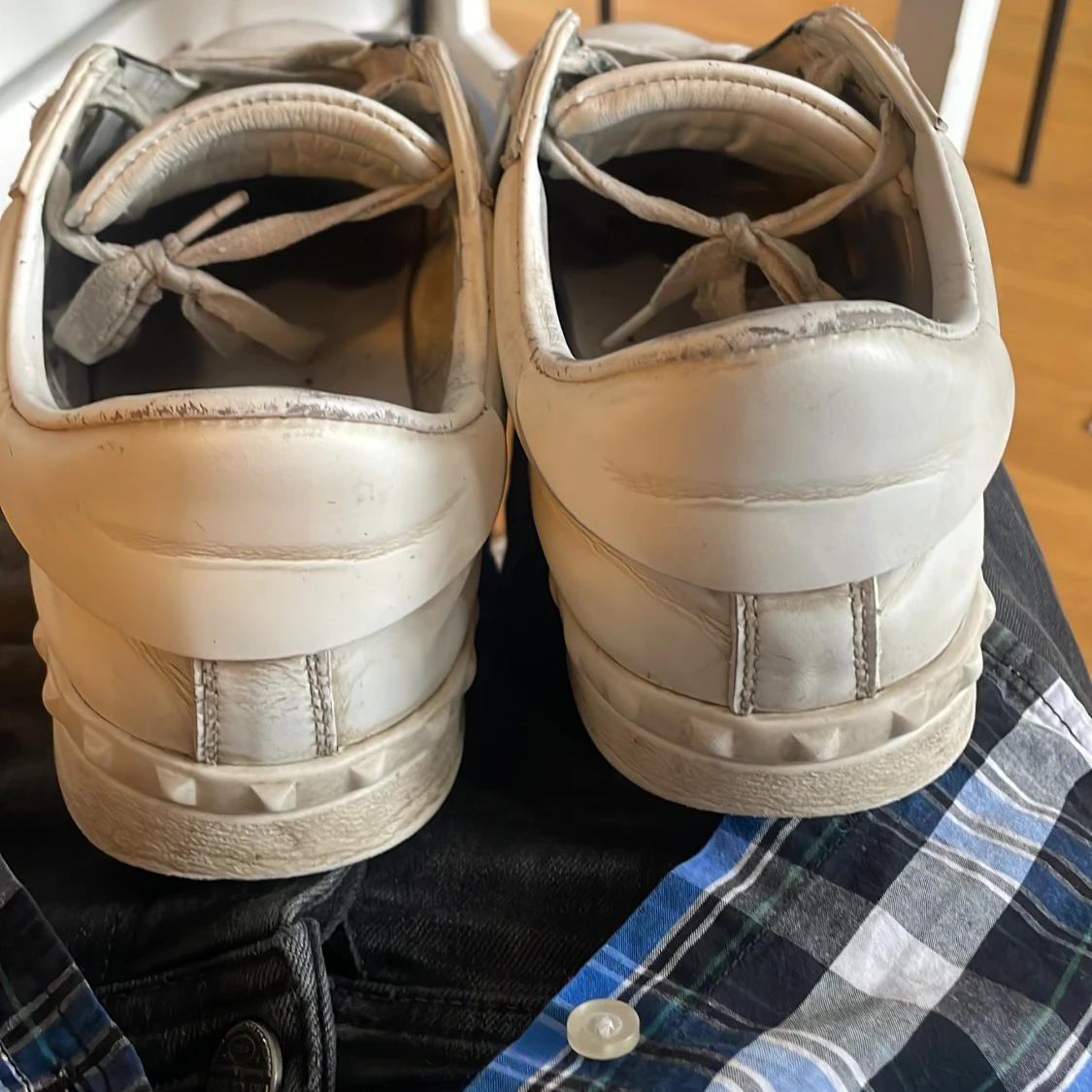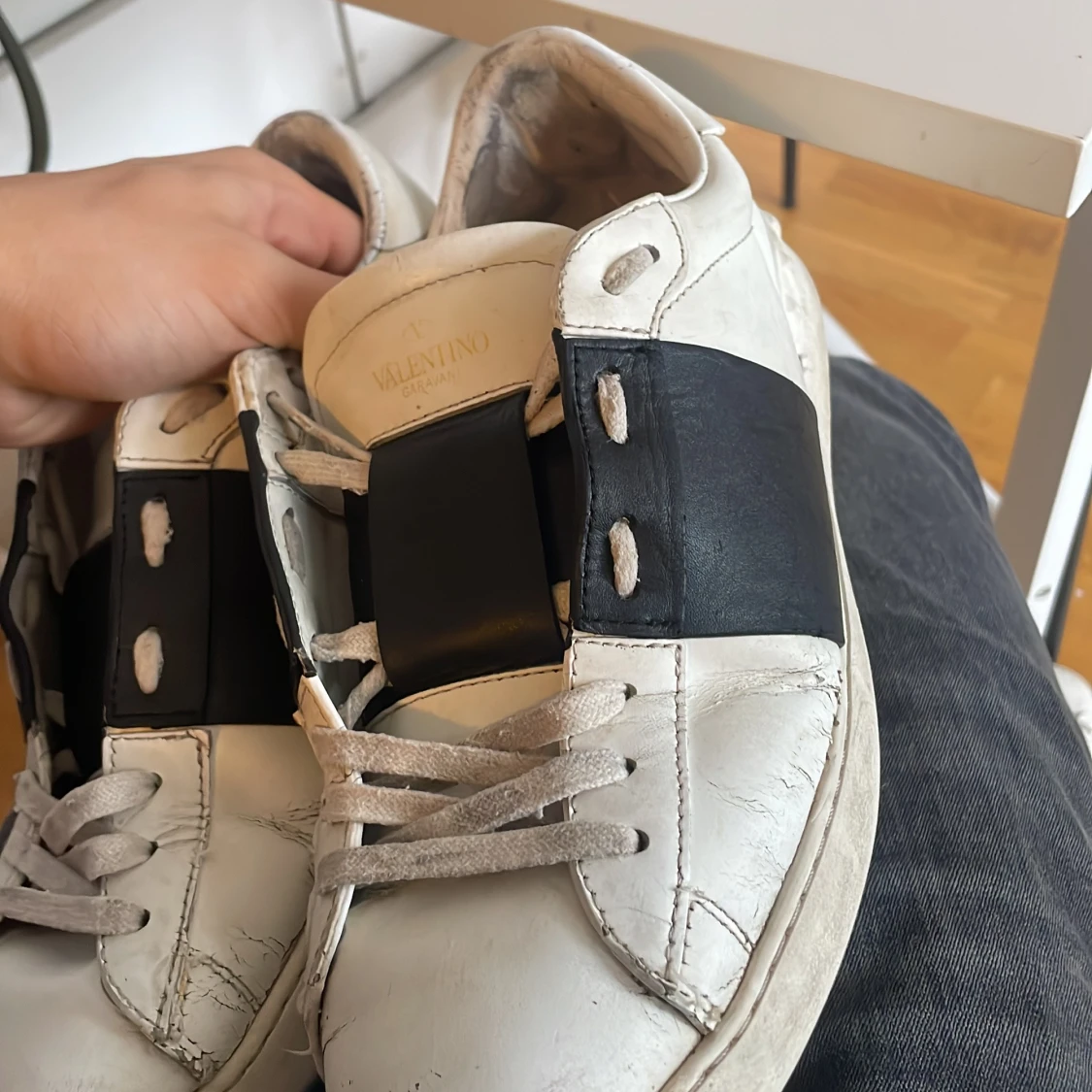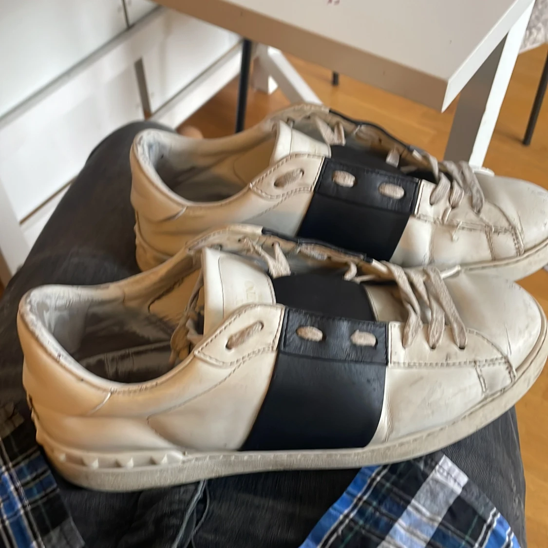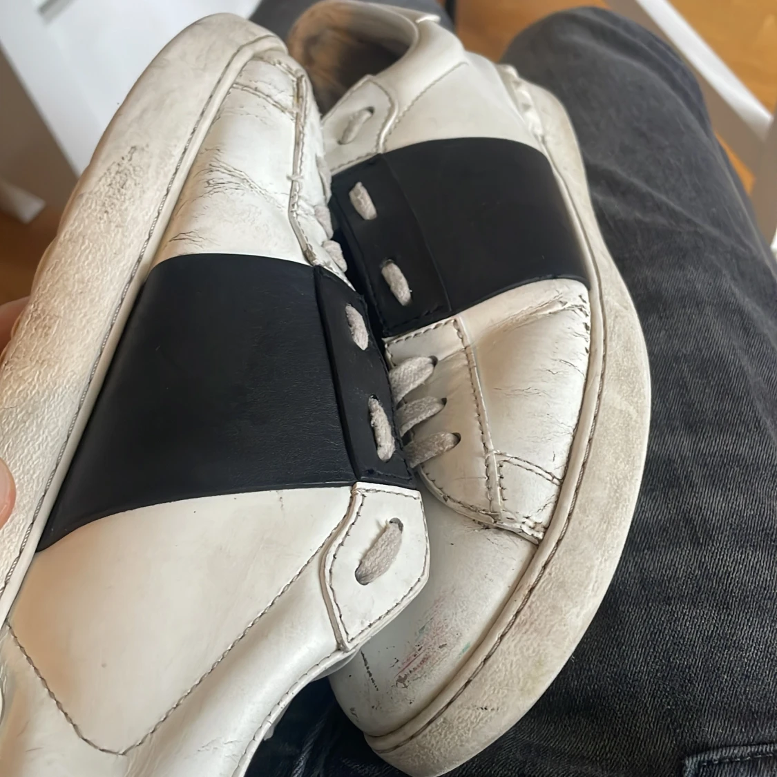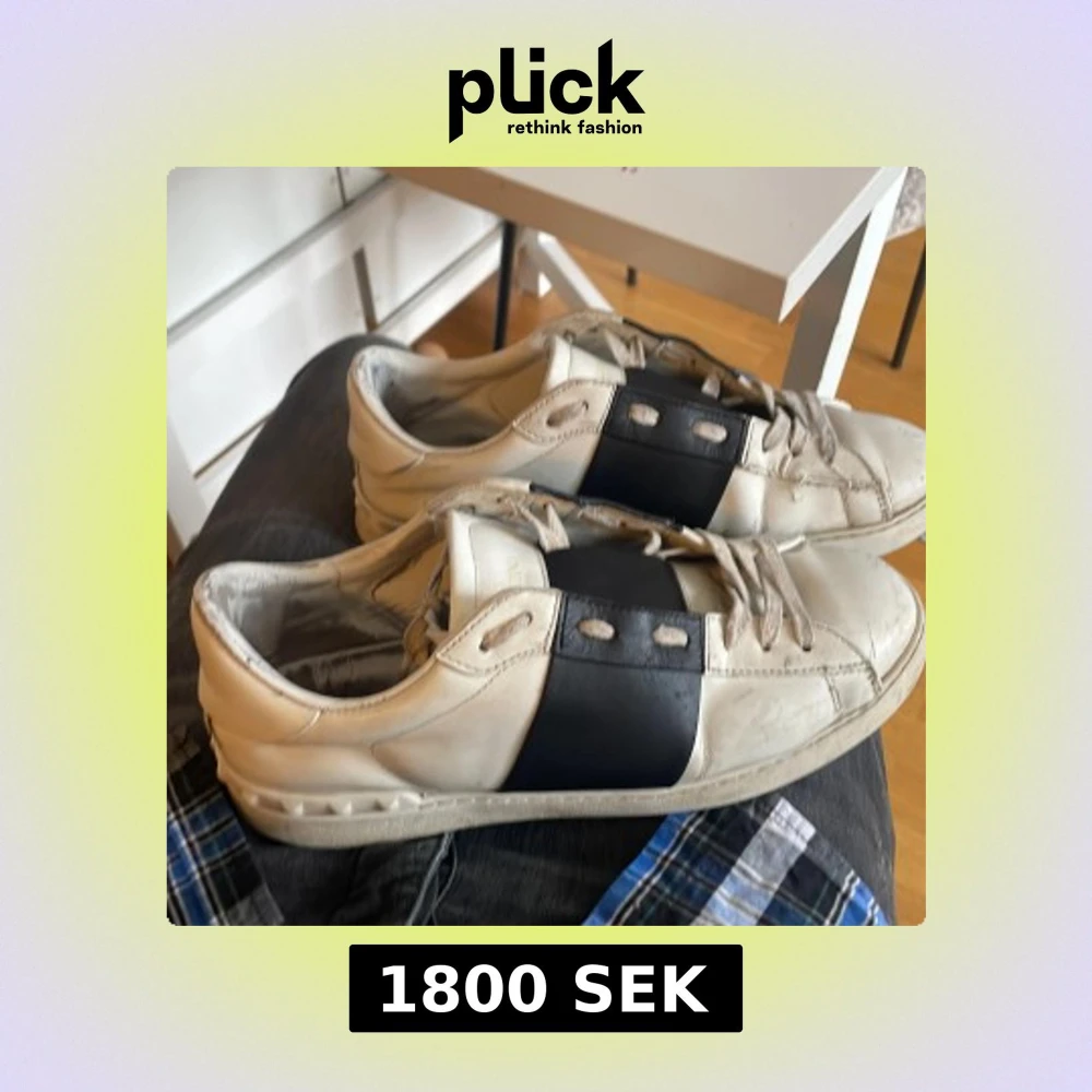 Snygga vita sneakers från Valentino. Skorna är äkta och köpta i butik tyvärr inte låda kvar kan försöka leta upp kvittot men inget jag kan lova. Har använt skorna i ungefär 1år kanske. Men tröttnat på dem nu. Dom är lite slitna men funkar utan tvekan inga störta skavanker. Några creeses och lortiga är det enda.👌
