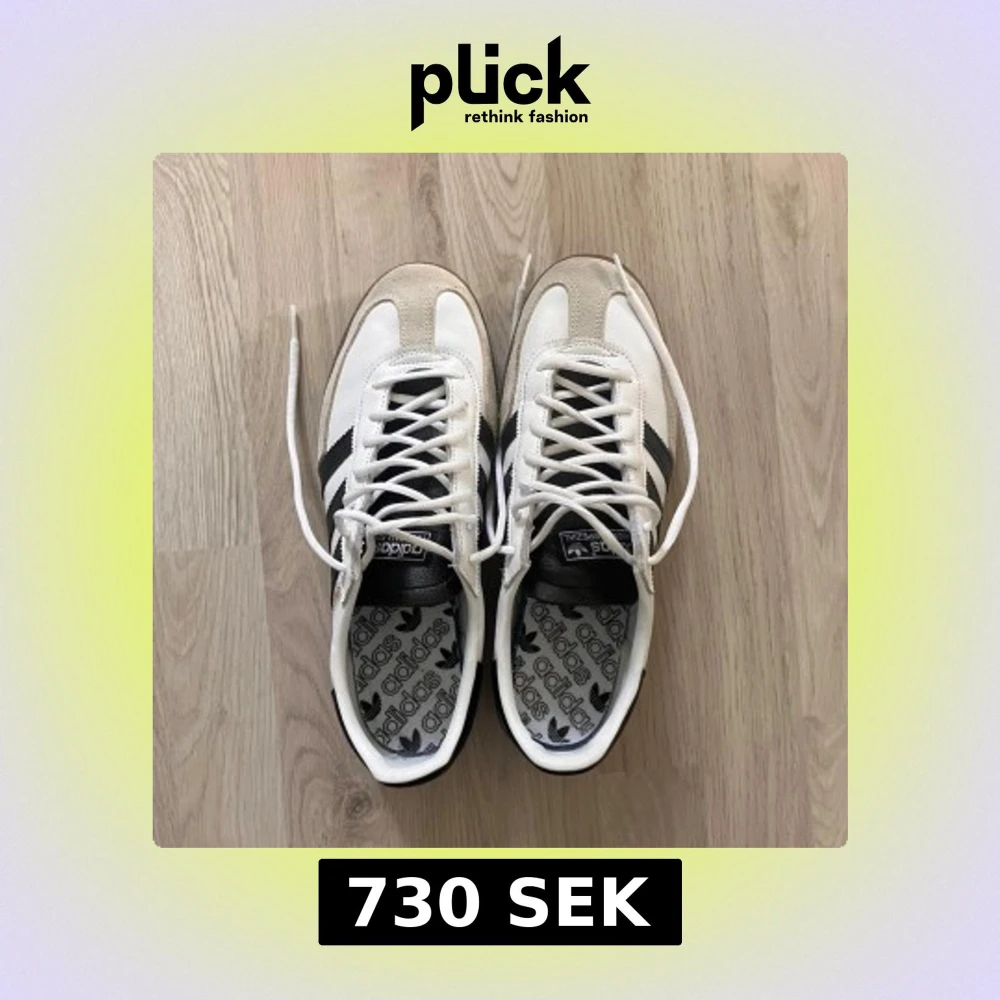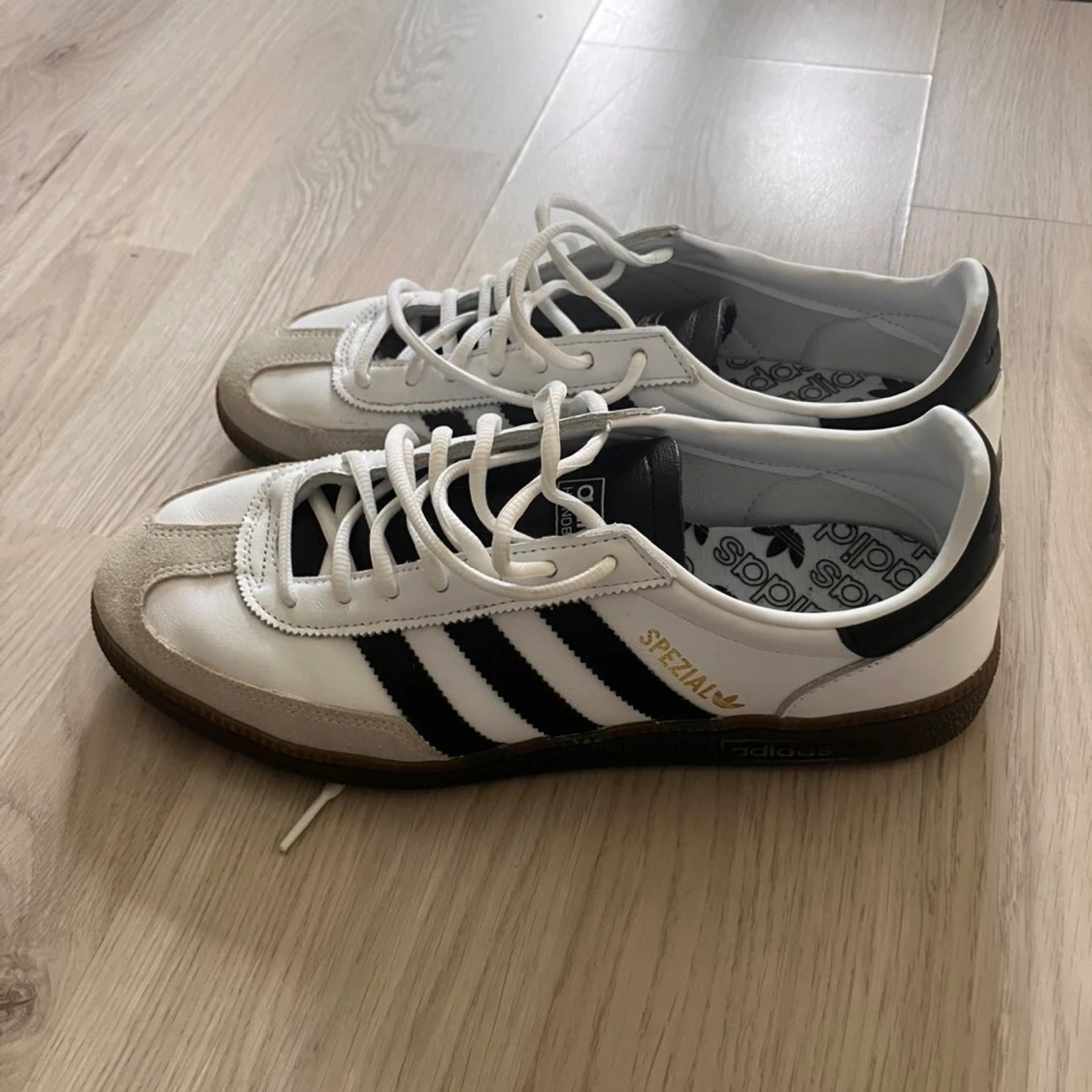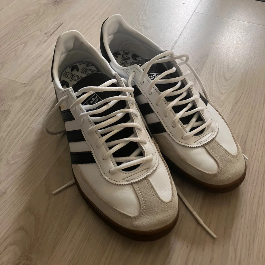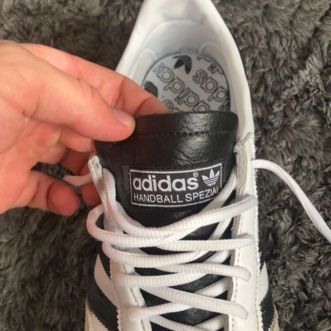 Säljer ett par Adidas Handball Spezial sneakers i vitt med svarta detaljer och klassiska tre ränder på sidorna. I storlek 43 1/3. I nytt skick, utan prislapp. Nytt pris är runt 1000kr. Ovandelen är i skinn och mocka, med vit snörning och gummisula. Snygg retrostil med svart häl och tunga, samt guldfärgad 'Spezial'-text på sidan. Kontakta mig vid frågor eller för fler bilder.