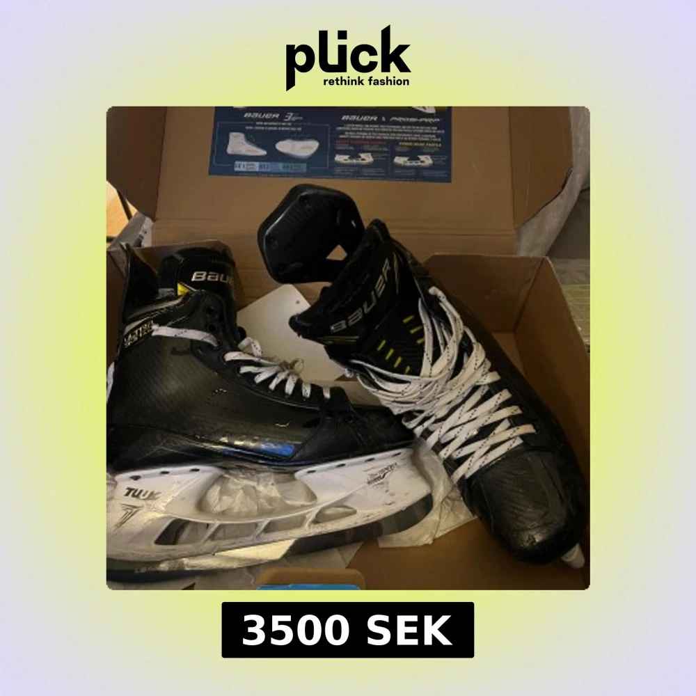 Säljer ett par svarta Bauer Supreme Ultrasonic hockeyskridskor med vita snören och detaljer i gult. Skridskorna har en robust och sportig design med kolfiberlook och vit plastskena. Perfekta för dig som vill ha grym prestanda på isen.