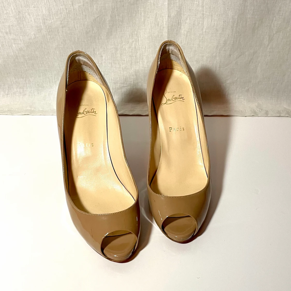Modell: LADY PEEP PATENT LEATHER HEELS - BEIGE strl 40. Klack: 10 cm. Säljer dessa vackra äkta Louboutin då de tyvärr inte kommer till användning hos mig. Fint skick. Köpte dem av en kvinna som använt dem ett par gånger. Ovanligt välbehållna, skor i detta skick brukar återförsäljas för ca 2400kr.