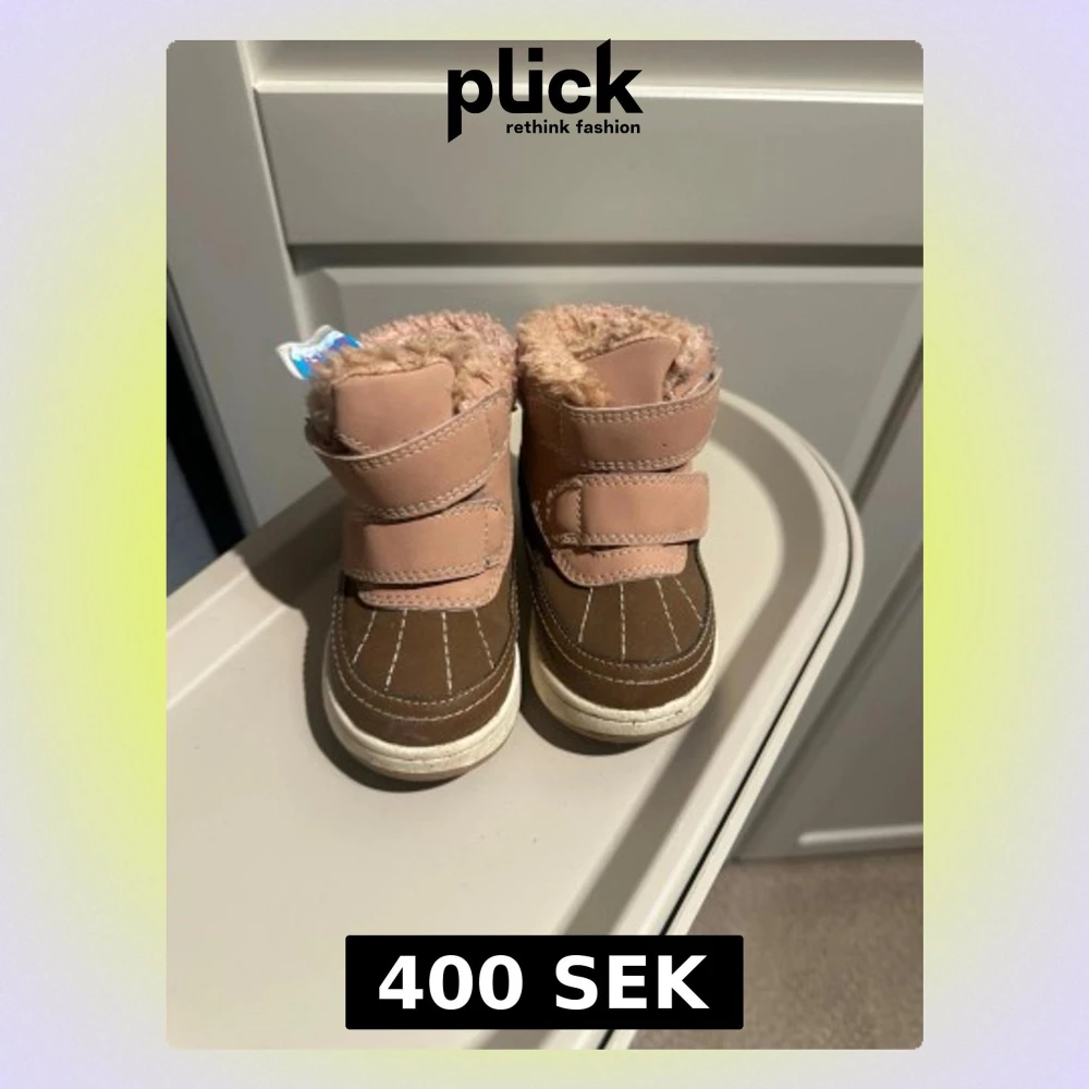 Säljer ett par gulliga boots i beige och rosa med mjukt foder och kardborreband. Skorna har vit sula och är perfekta för kalla dagar. Fodret är fluffigt och värmande, och utsidan är i skinnliknande material med snygga sömmar. Vattentäta