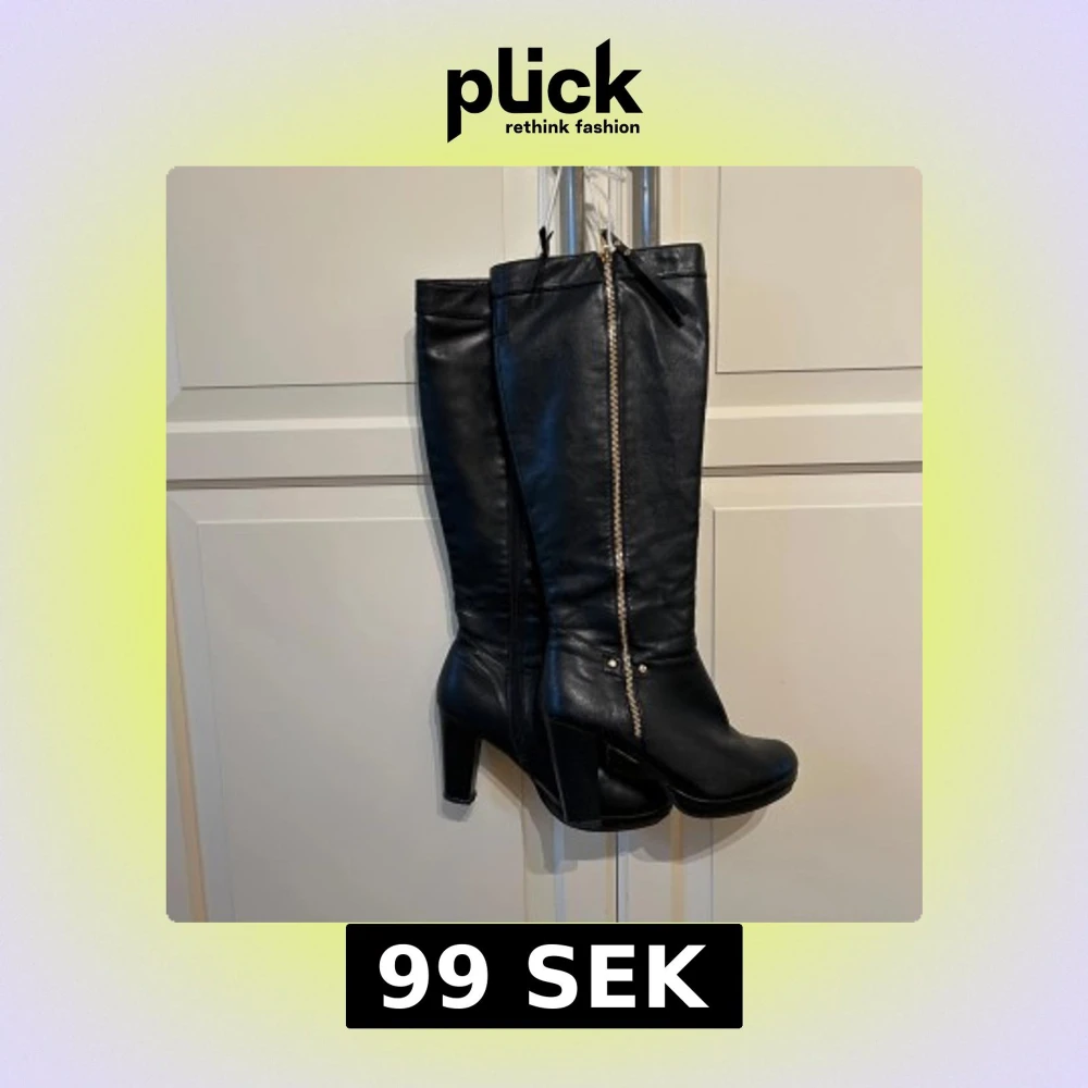 Säljer ett par svarta höga stövlar med grov klack och guldfärgad dragkedja längs utsidan. Stövlarna är i skinnimitation och har rund tå. I strl 38