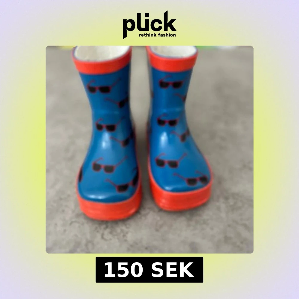 Färgglada blå gummistövlar med rött skaft och sula, dekorerade med ett coolt solglasögonmönster. Perfekta för regniga dagar och lek utomhus. Lätta att dra på tack vare öglan bak.