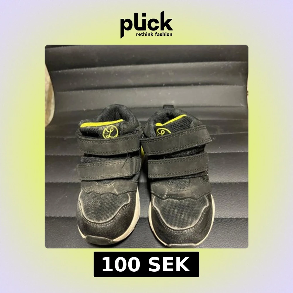 Säljer ett par svarta sneakers med kardborreband och gula detaljer. Skorna har en robust sula och är perfekta för vardagsbruk. De är lätta att ta på och av tack vare kardborrebanden.