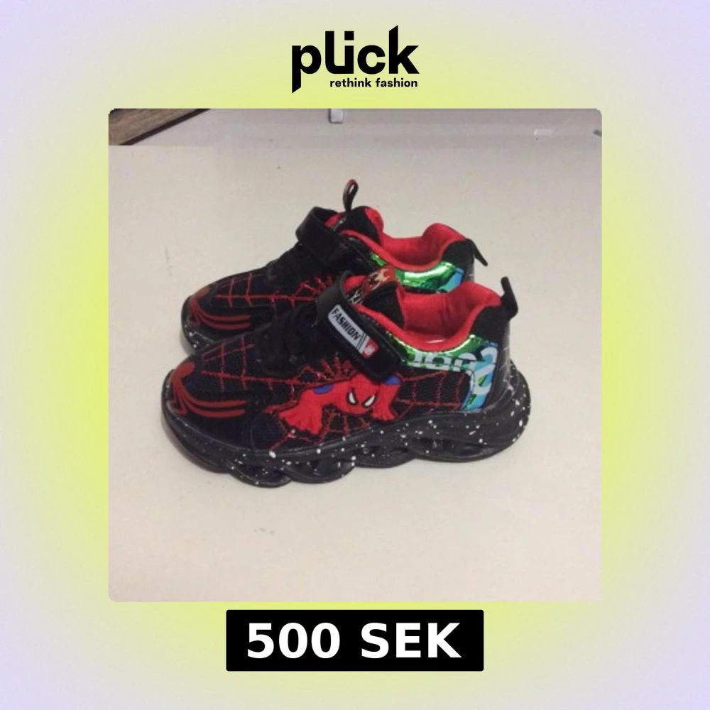 Coola svarta sneakers med röd Spiderman-design, spindelnätsmönster och färgglada LED-lampor i sulan. Skorna har kardborreband, gröna metallicdetaljer och röd insida. Perfekta för dig som vill sticka ut med snygga och lekfulla skor.
