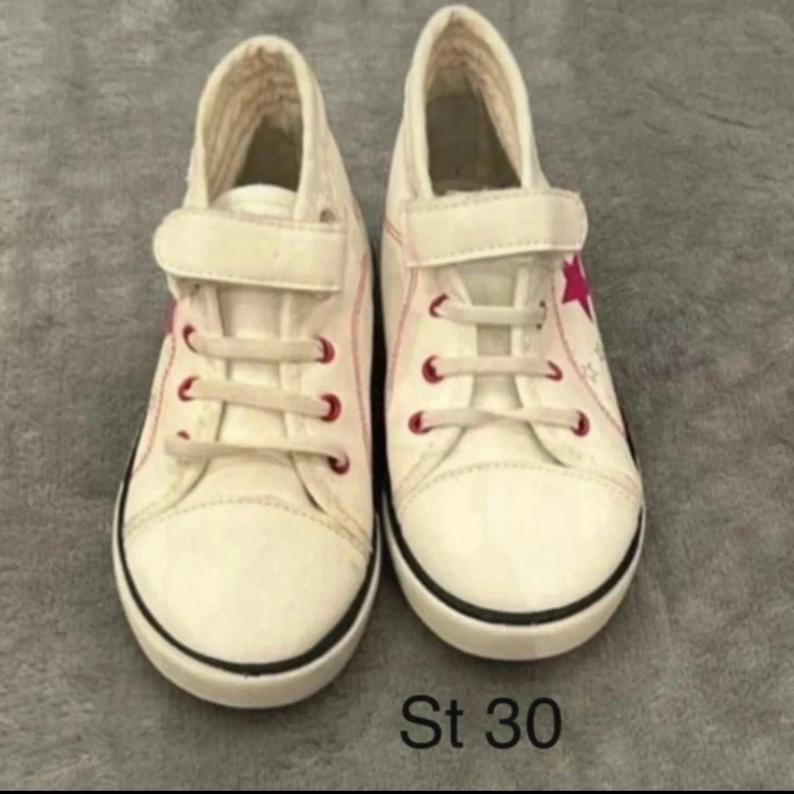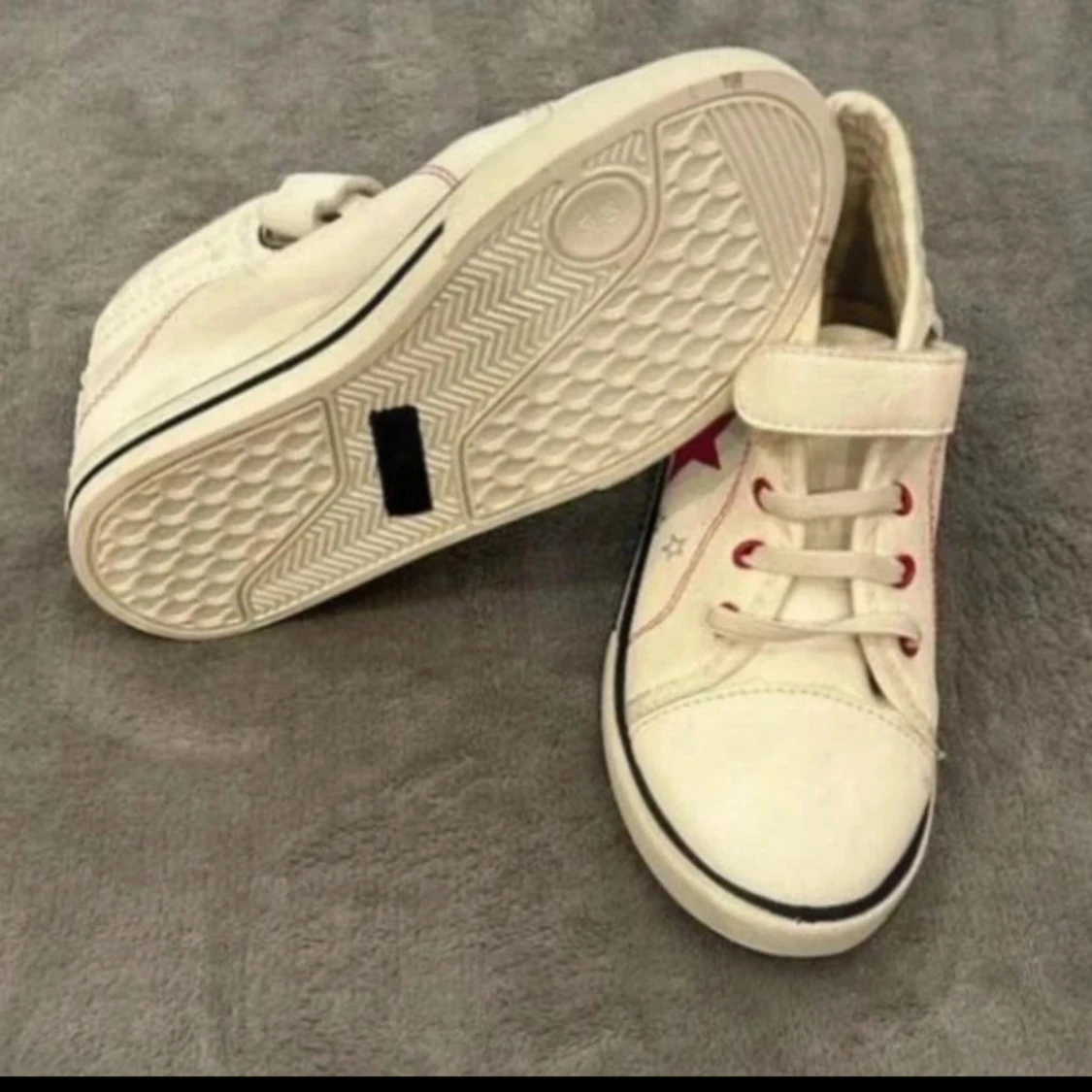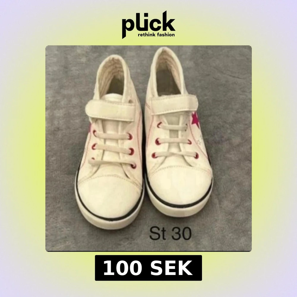 Snygga vita sneakers i storlek 30 med röd stjärndetalj på sidan och röda öljetter. Skorna har både snörning och kardborreband för enkel påtagning. Rund tå och platt sula ger en klassisk look. Perfekta för dig som gillar stilrena och coola detaljer.