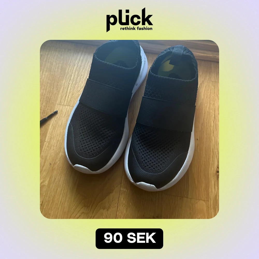 Säljer ett par svarta sneakers i mycket bra skick. De har en elastisk rem över foten för en tight passform och en vit sula som ger en snygg kontrast. Perfekta för både träning och vardagsbruk. Storlek är inte specificerad, men de ser ut att vara i normal passform.