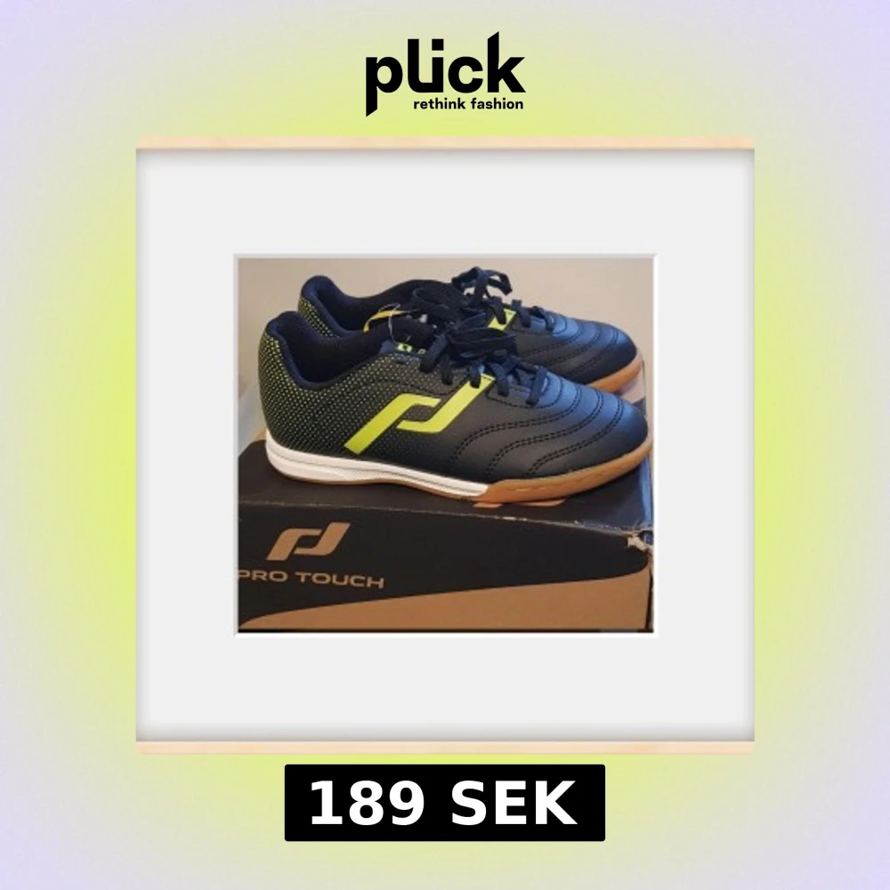 Snygga svarta fotbollsskor från Pro Touch med limegröna detaljer och prickigt mönster på hälen. Skorna har snörning, rund tå och platt gummisula i brunt. Perfekta för inomhusspel och har en sportig look som sticker ut på planen.