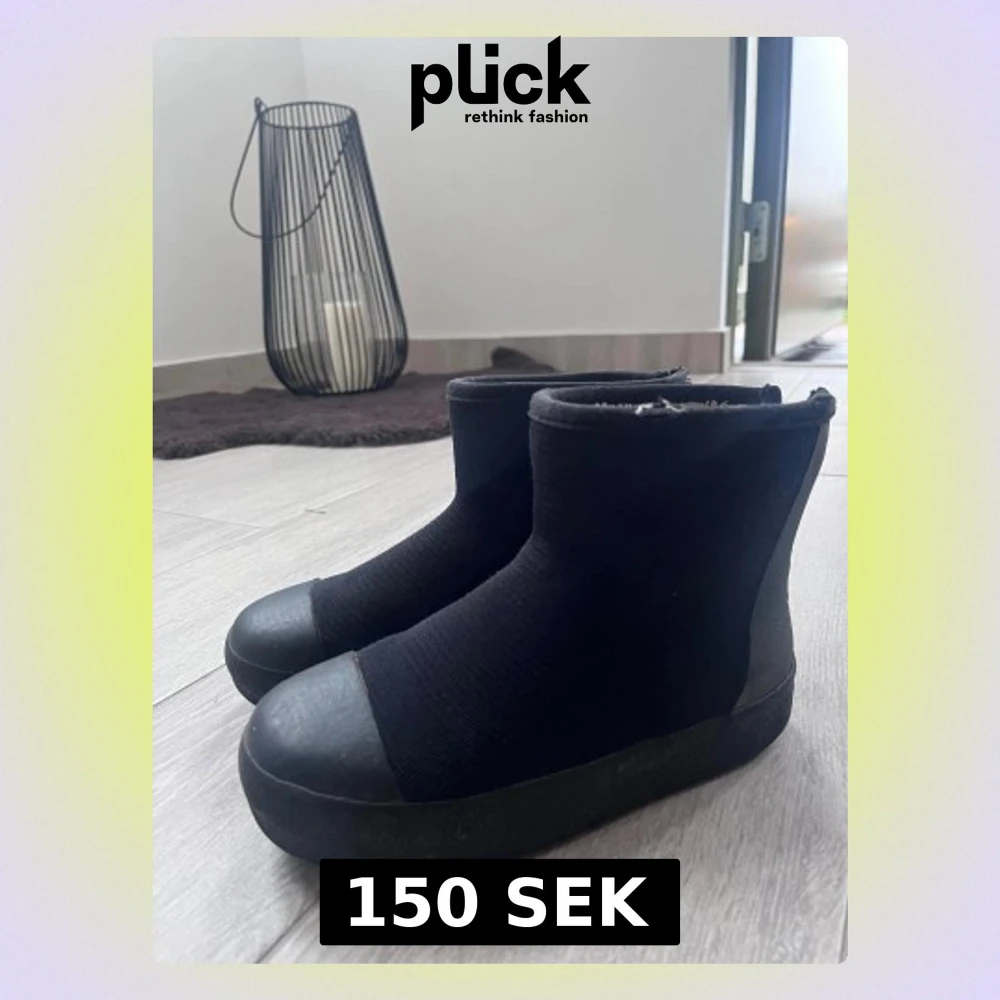 Säljer ett par svarta boots med rund tå och platt sula. Skorna har dragkedja bak och är fodrade med mjukt material på insidan. Ovandelen är i textil och tå samt sula i gummi, vilket ger en clean och modern look.