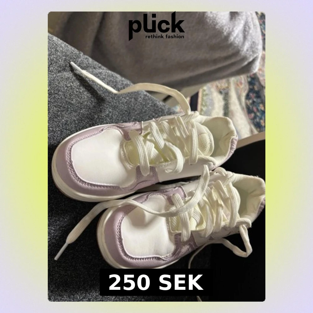 Säljer ett par snygga sneakers i vitt och ljuslila med klassisk snörning och grov gummisula. Skorna är från soc med storleken 32 och de är nästan oanvända.