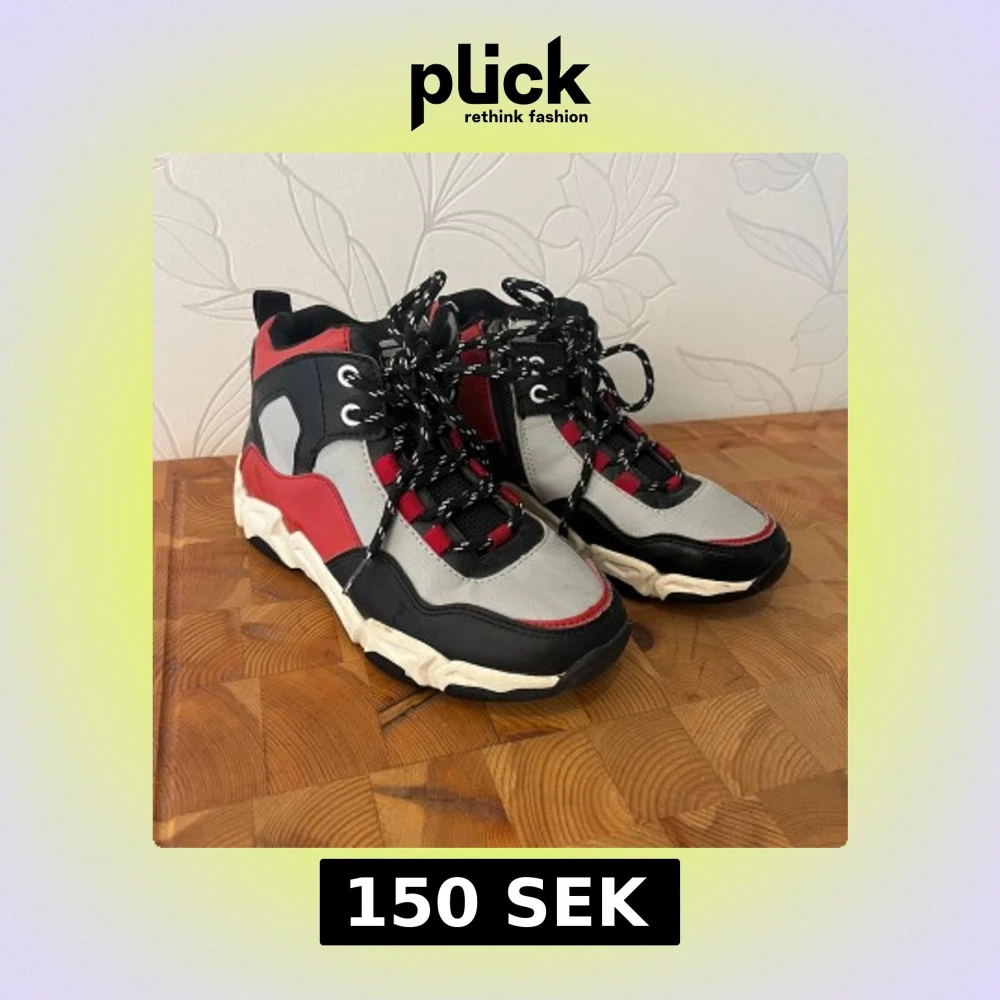 Snygga kängor i rött, svart och grått. Använda ett fåtal gånger. Storlek 32-33