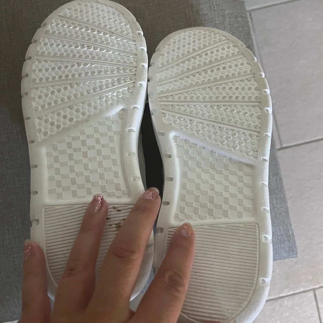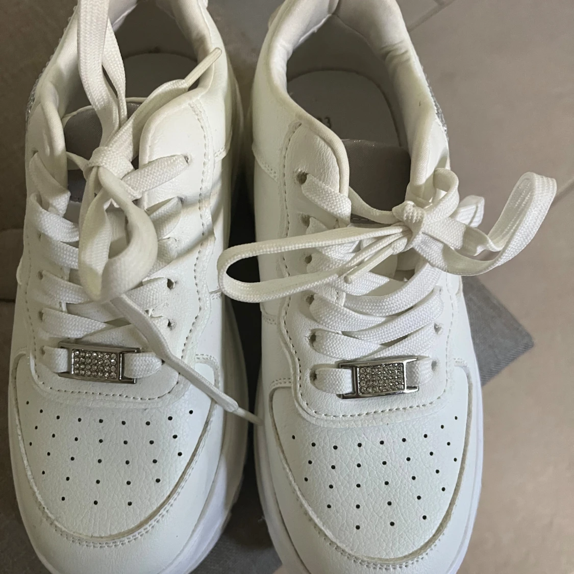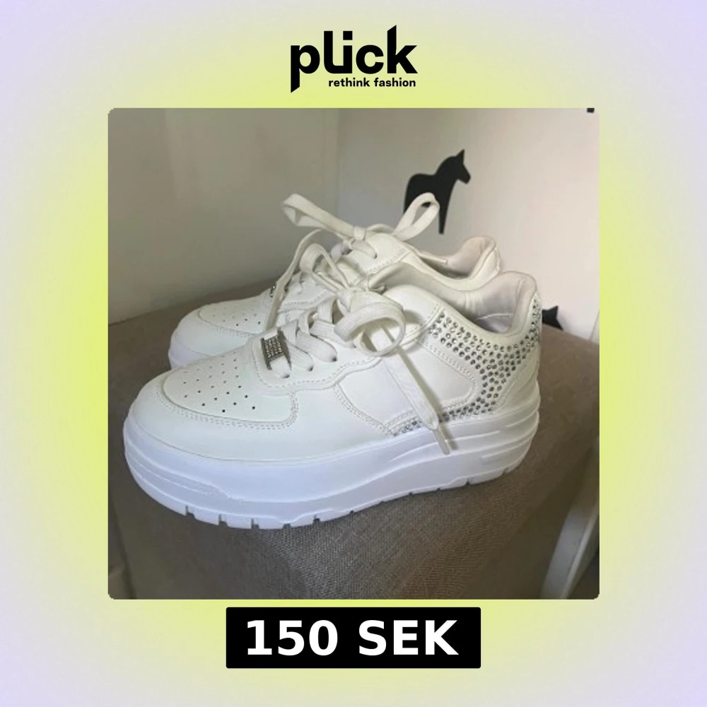 Snygga vita chunky sneakers med platåsula och glittrande strassdetaljer på hälen. Skorna har snörning, perforerad tå och en dekorativ metallbricka med stenar på snörena. Bara provade, säljes pga fel storlek. Strl 33.