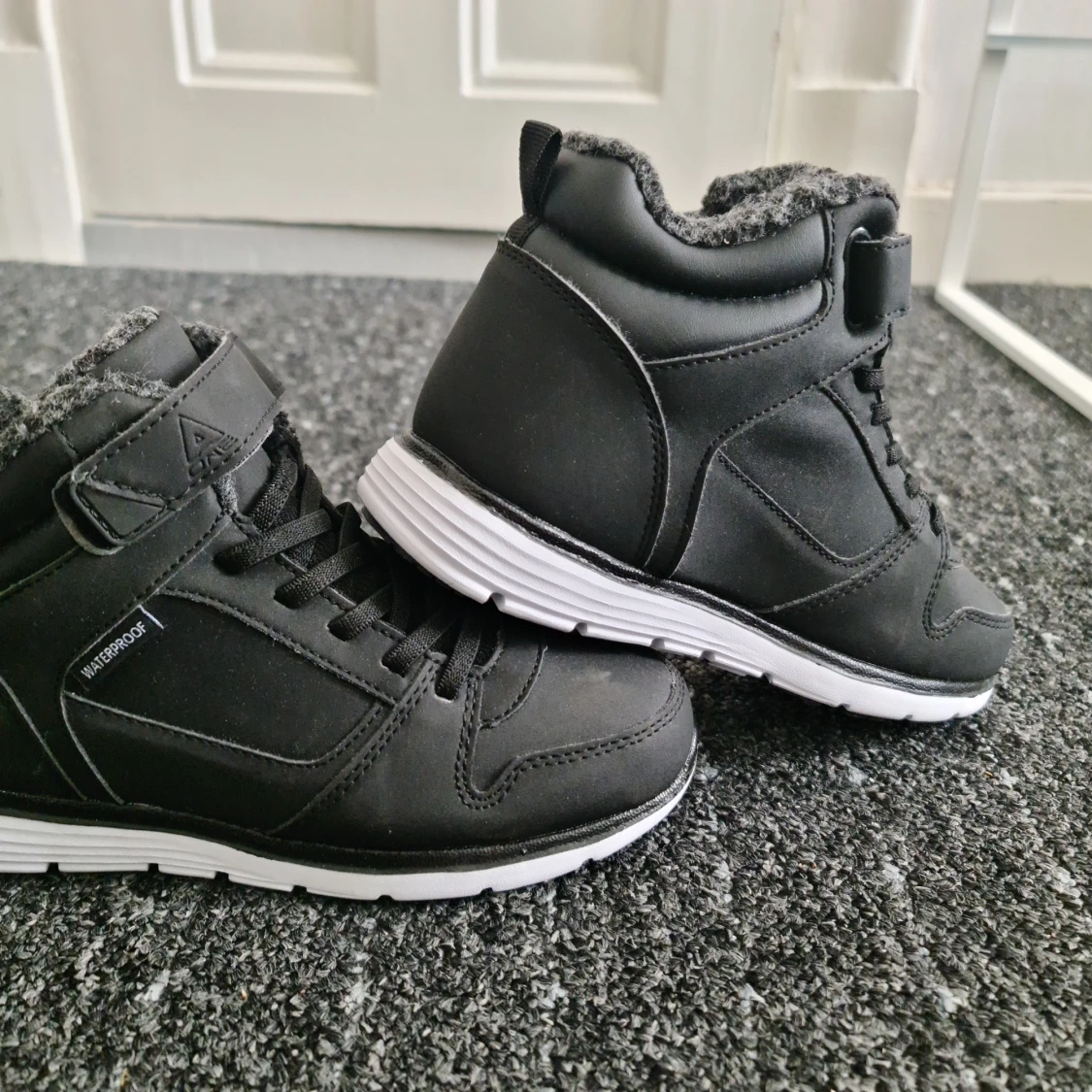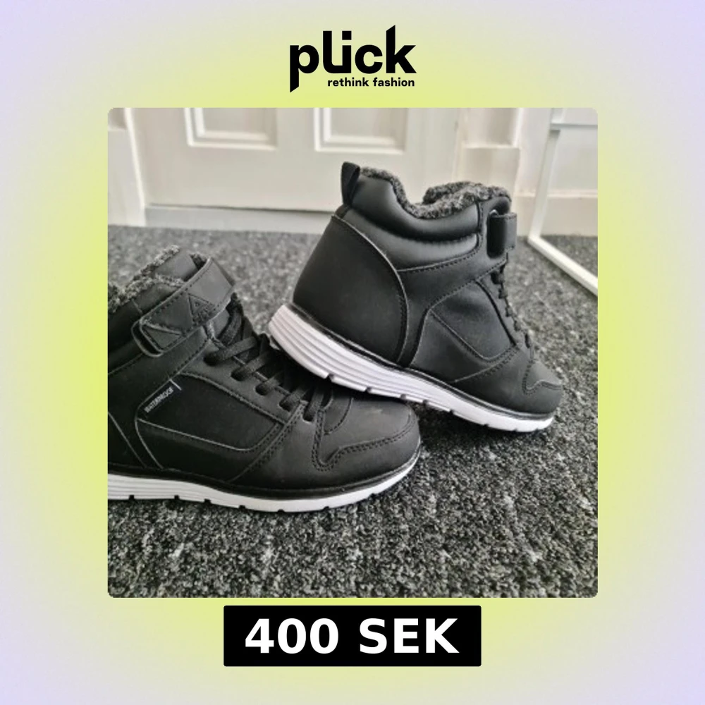 Svarta kängor med vit sula och snörning, fodrade med mjukt material för extra värme. Vattentäta och perfekta för kalla dagar. Sportig design med kardborreband upptill och diskreta sömmar.
