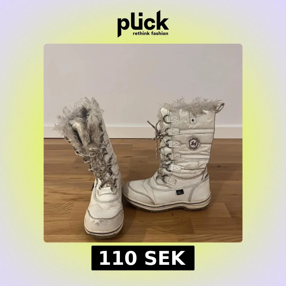 Säljer ett par vita vinterstövlar från leat med snörning och fluffig fuskpäls upptill. Stövlarna har rund tå, platt sula och är fodrade för extra värme. Perfekta för kalla dagar och har en sportig look med detaljerade sömmar. Är lite slitna framtill men är absolut inget man tänker på därför skulle jag säga att det är i mycket bra skick!!