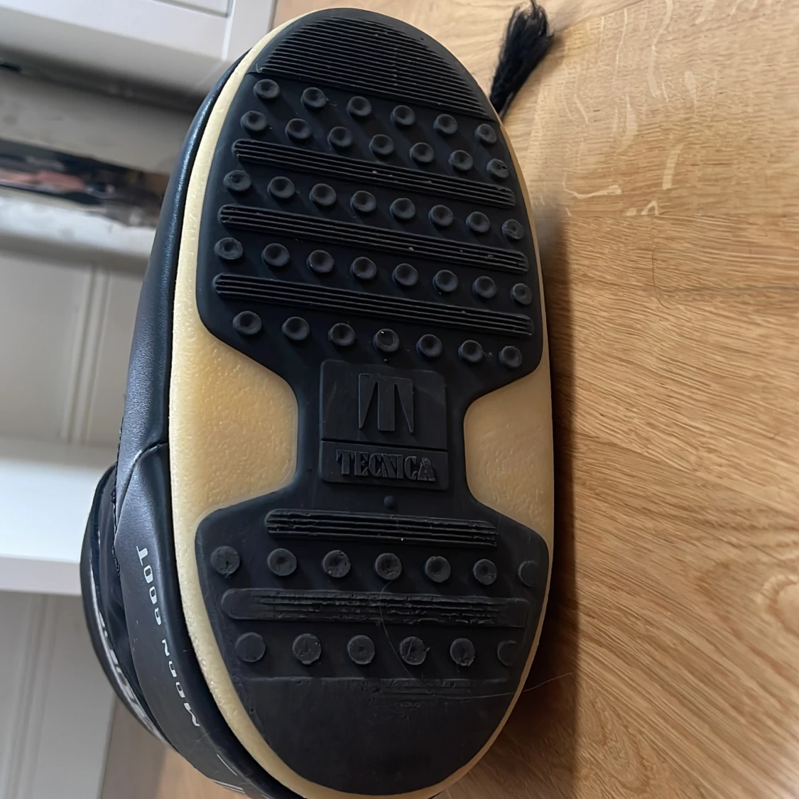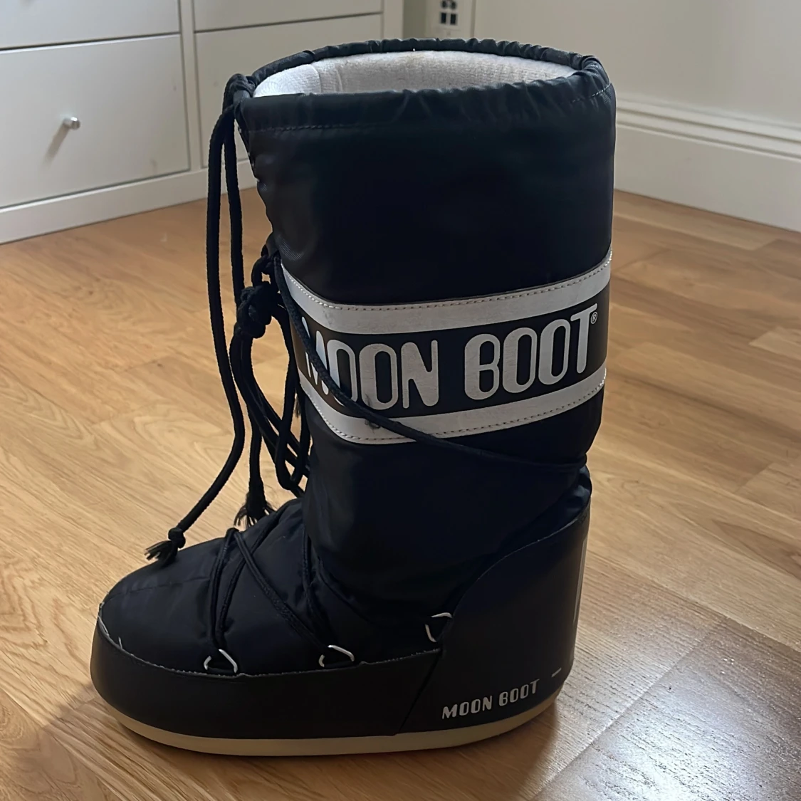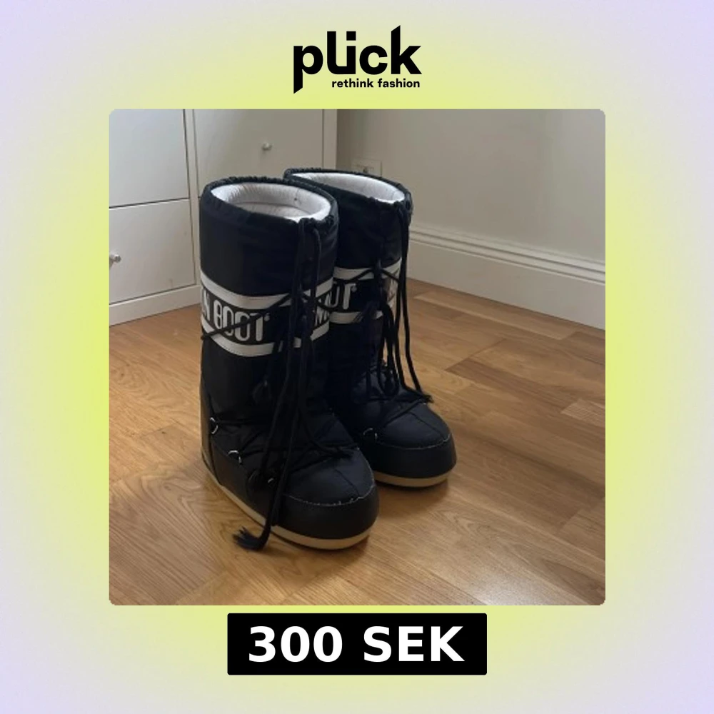 Säljer ett par klassiska svarta Moon Boot med vit logga och snörning framtill. Skorna har en hög, vadderad design med platt sula och grovt mönstrad undersida för extra grepp. Perfekta för vintern och håller fötterna varma och torra.