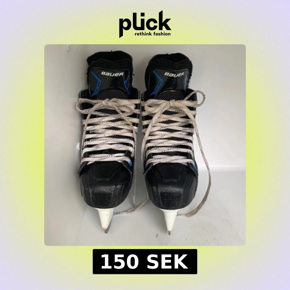 Säljer ett par svarta Bauer Nexus N6000 hockeyskridskor med blå och grå detaljer. Klassisk design med vit sula och snörning framtill. Perfekta för isträning eller match. Sköna och stabila på foten.