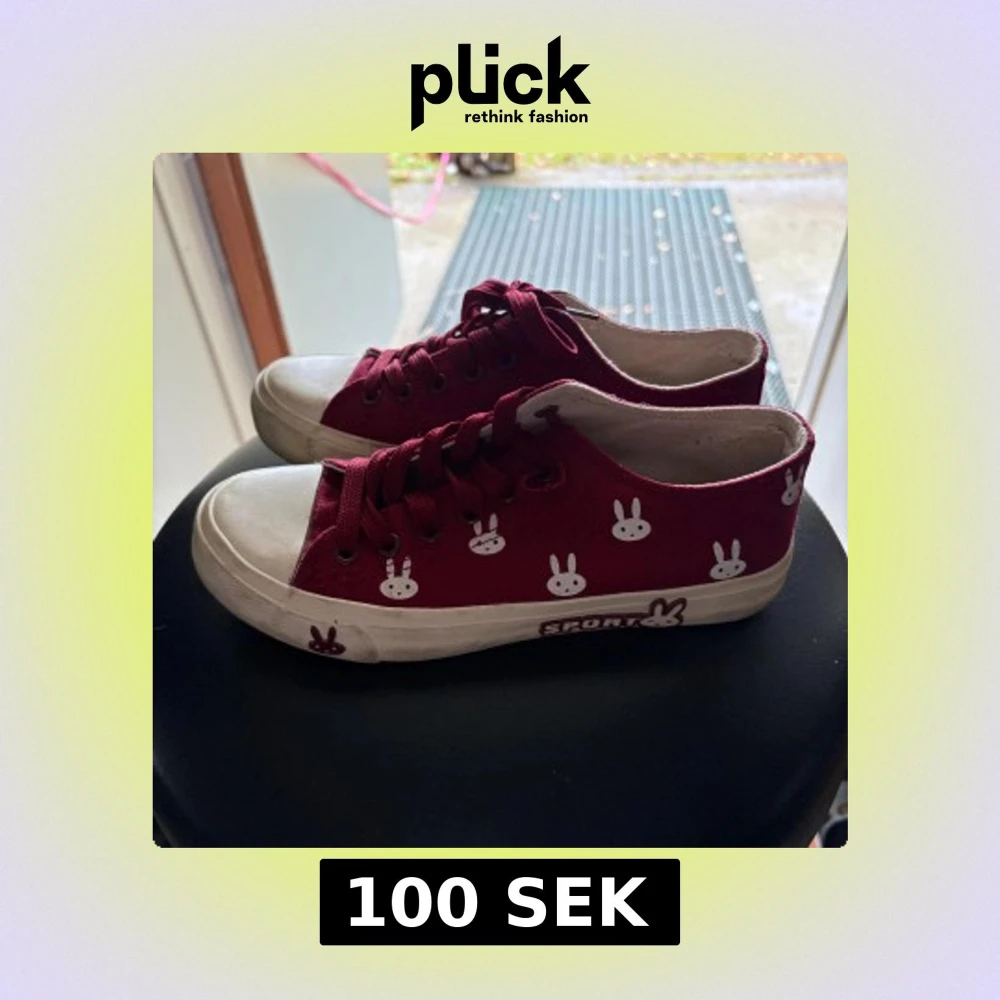 Säljer ett par vinröda sneakers med vita kaninansikten tryckta över hela skon. Skorna har vita tåhättor och sulor, samt klassisk snörning. Ovandelen är i tyg och sulan är platt. Perfekt för dig som gillar gulliga detaljer och vill sticka ut.