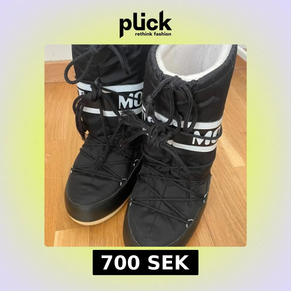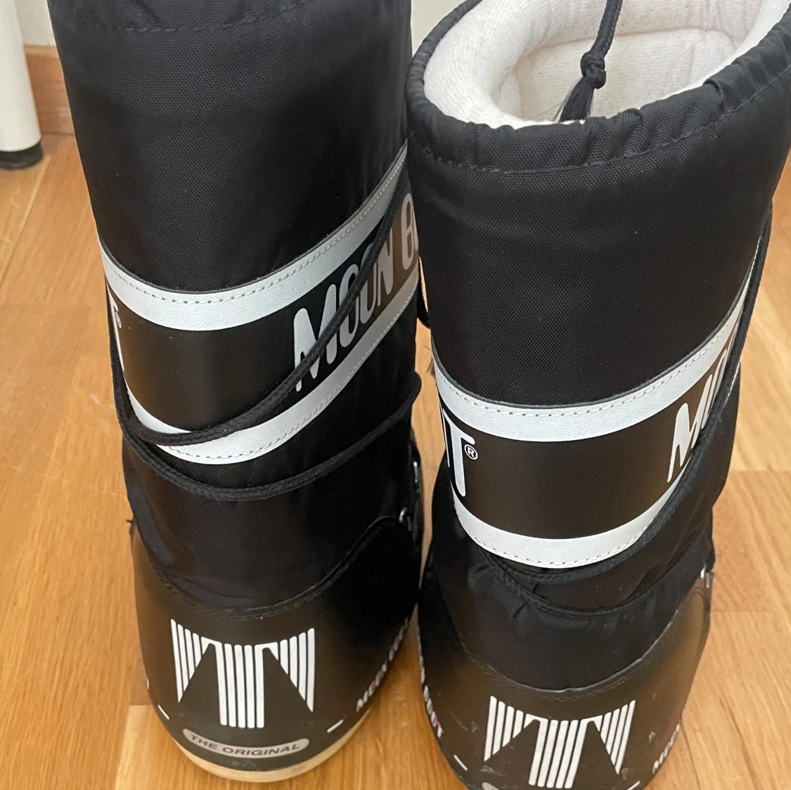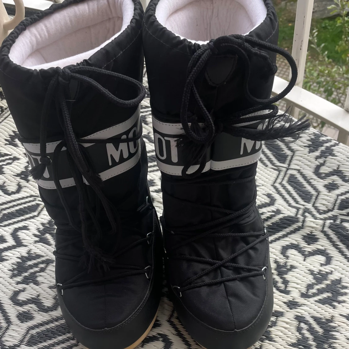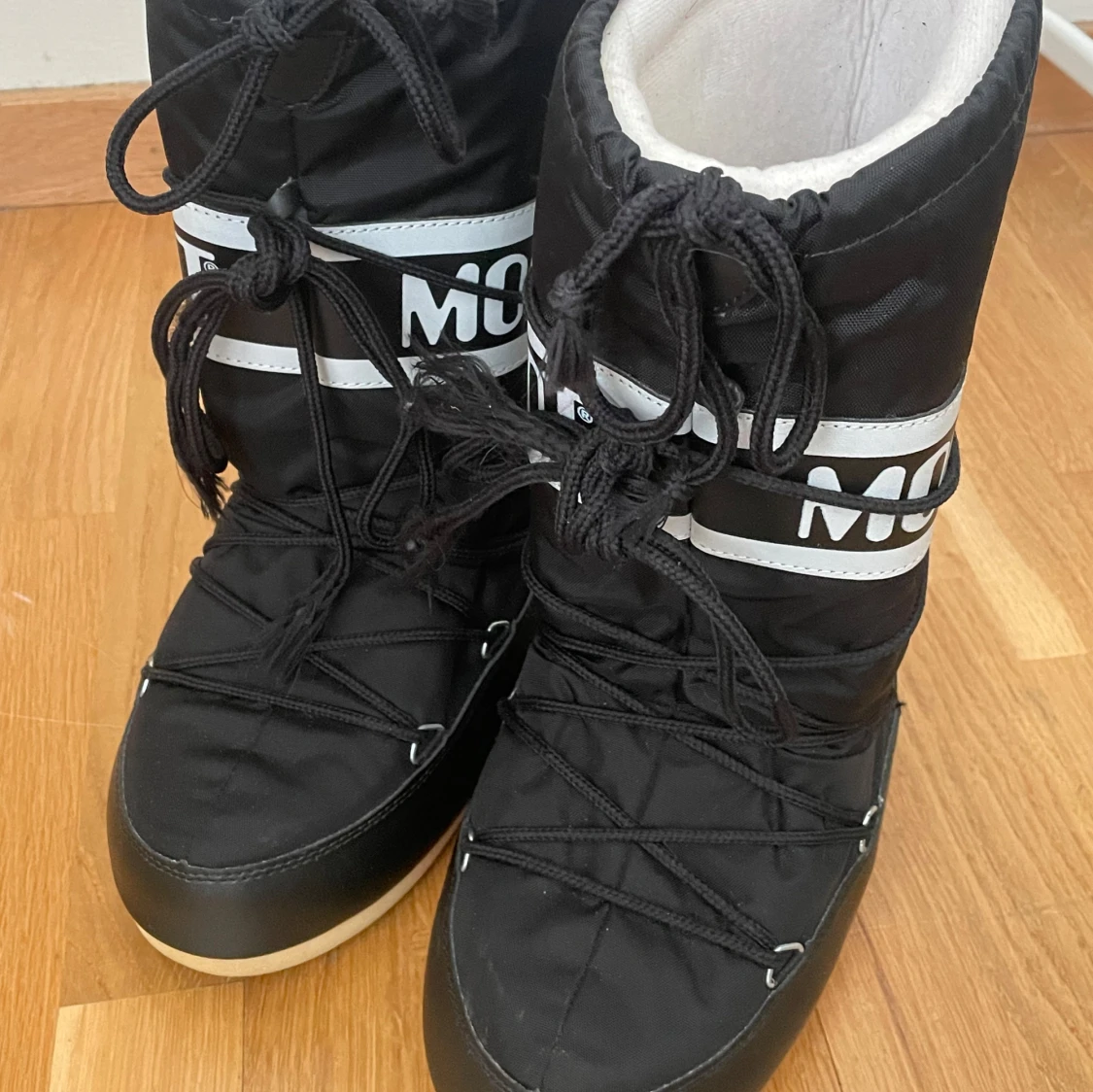 Säljer ett par svarta Moon Boots med vit text och snörning. Perfekta för vintern med sin varma och vadderade design. De har en hög modell och är kända för sin unika stil och komfort.