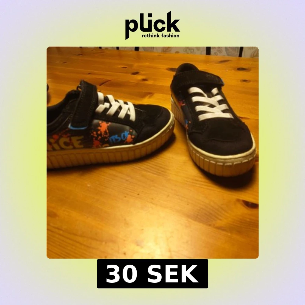 Svarta sneakers med vit snörning och bred kardborre. Sidorna har färgglada graffiti-inspirerade tryck med texten 'NICE' och orange färgstänk. Sulan är beige och har en grov struktur. Skorna har rund tå och platt sula, passar dig som gillar streetstyle. Barn skor storlek 30