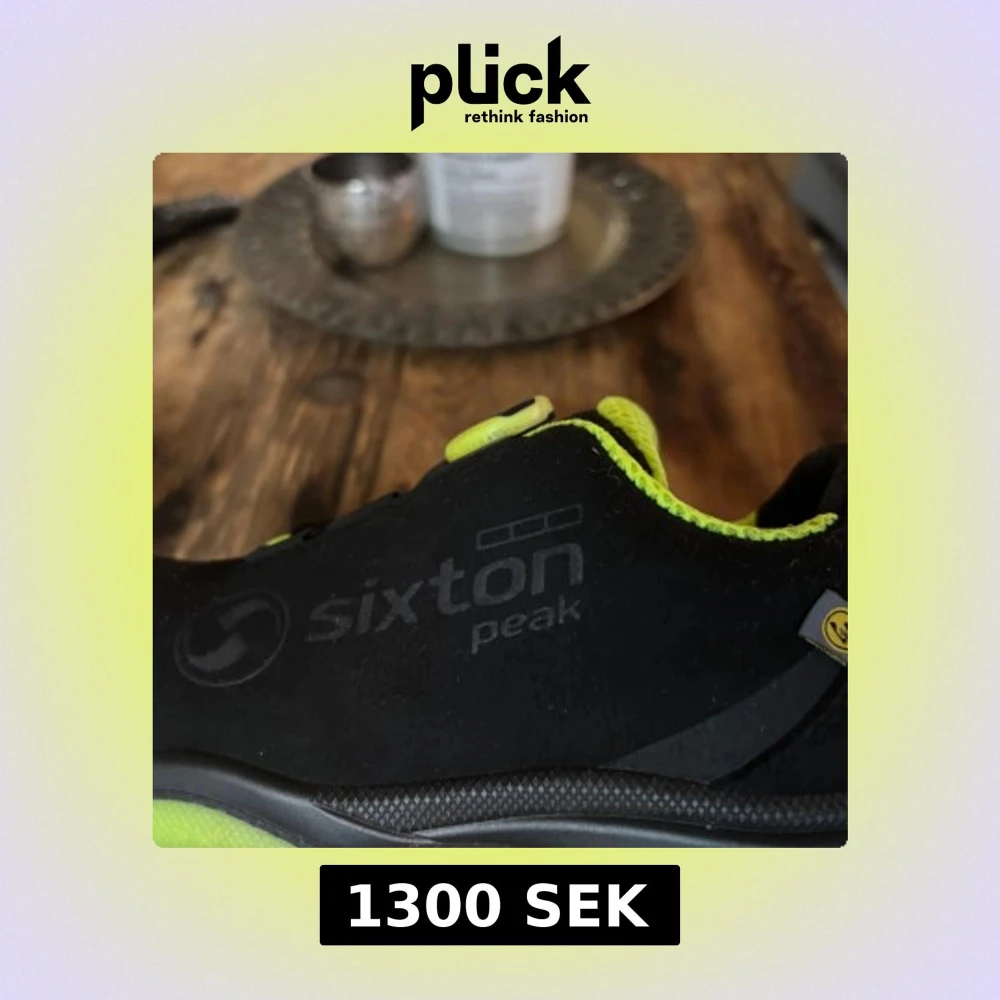 Säljer ett par svarta Sixton Peak skor med neongröna detaljer och BOA-snörningssystem. Skorna har en sportig design med förstärkt tå och är perfekta för utomhusaktiviteter.