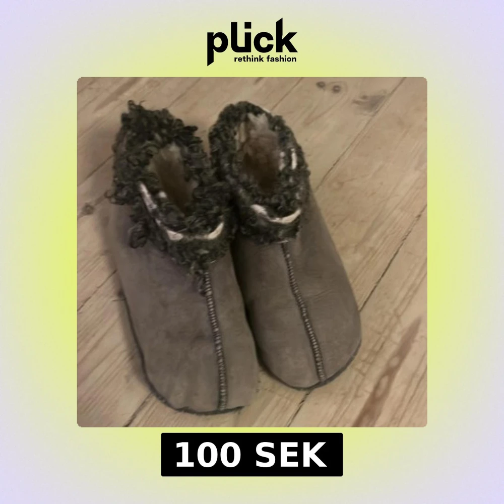 Mysiga grå tofflor i mocka med mjuk och lockig fårull runt öppningen. De har en platt sula och är sydda med synliga sömmar längs ovansidan. Perfekta för att hålla fötterna varma under kalla dagar.