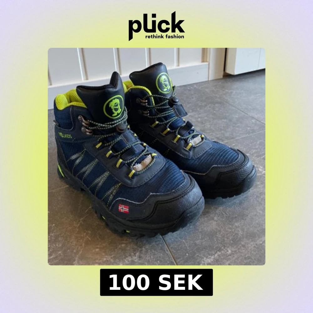 Bekväma blåa kängor med svarta och neongula detaljer. Grov sula i svart och gult, snörning framtill och norsk flagga på sidan. Sparsamt använd.