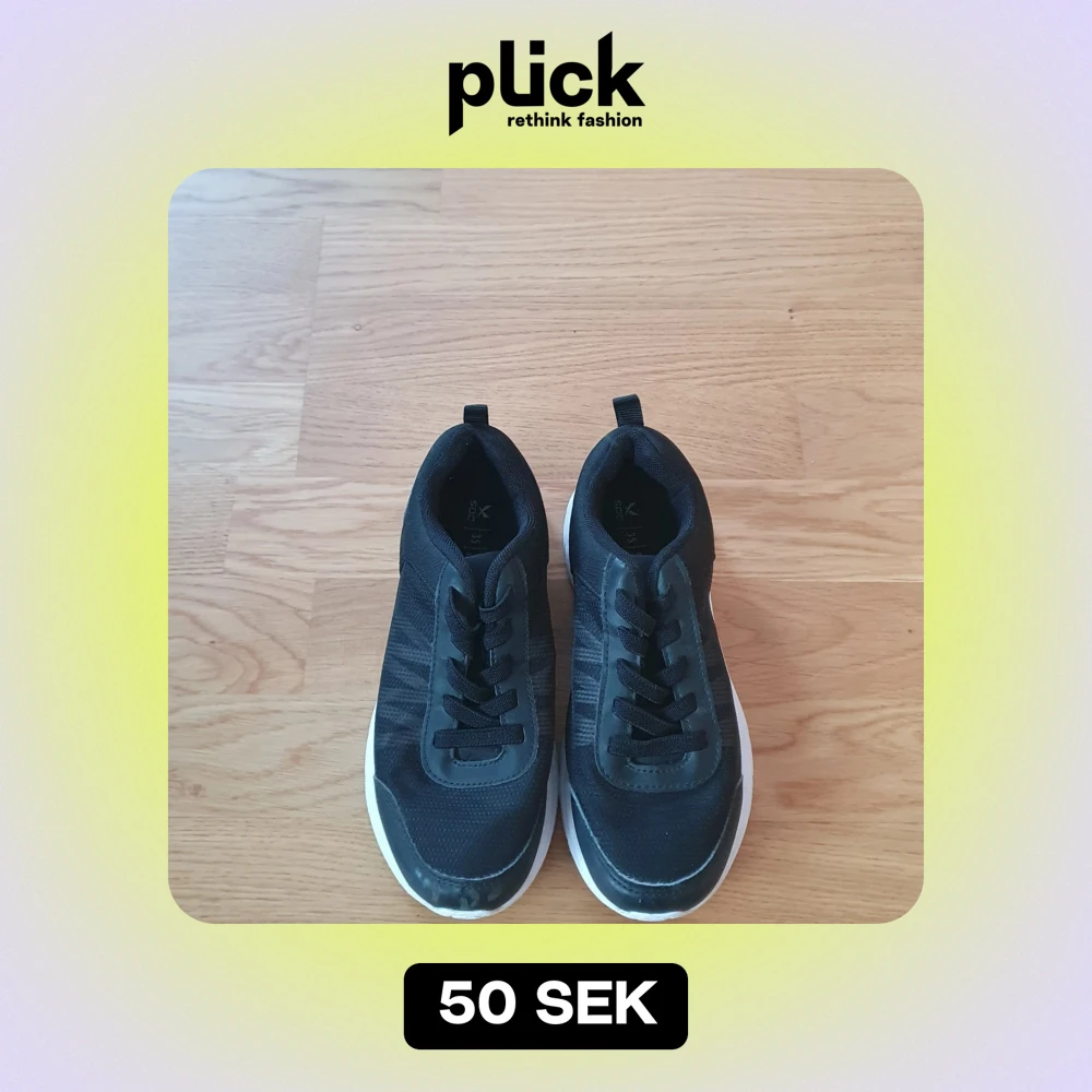 Säljer ett par svarta sneakers i mycket bra skick. De har en stilren design med snörning och en vit sula som ger en snygg kontrast. Perfekta för både vardag och träning. Storleken är inte angiven, men de ser ut att passa en normal passform.