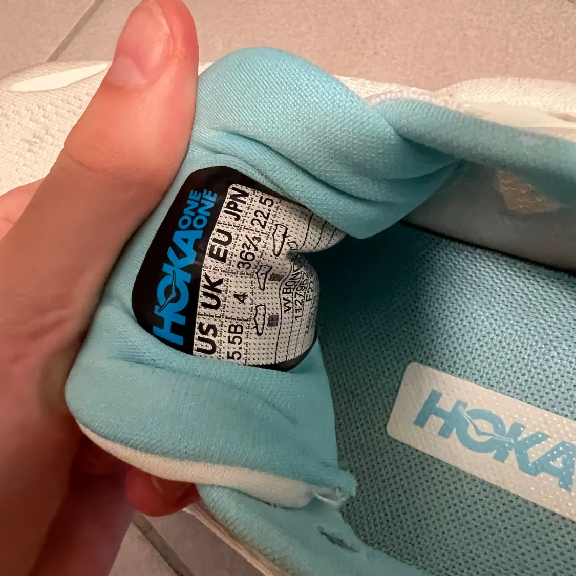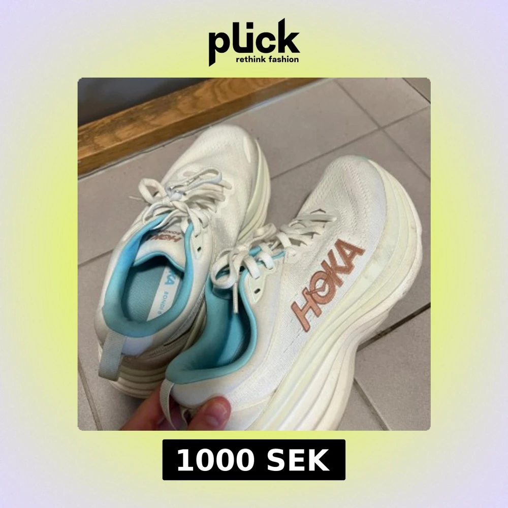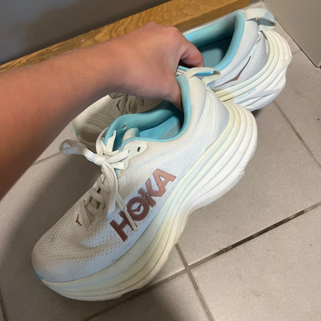 Snygga Hoka One One Bondi 8 sneakers i vitt med ljusblå insida och detaljer. Skorna har en chunky, extra tjock sula och HOKA-logga i kopparfärg på sidan. Perfekta för dig som gillar komfort och stil när du är ute och rör på dig.
