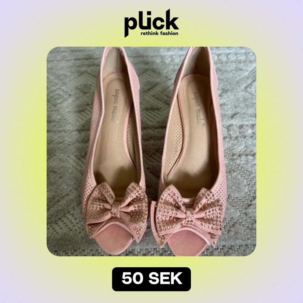 Jätte söta rosa klackar men rosett framtill med ”diamanter”. Inköpta för något år sedan på loppis men aldrig använda av mig pga lite stora.