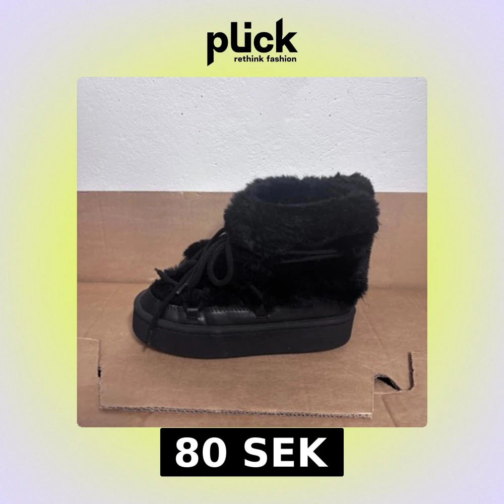 Säljer ett par svarta boots med fluffig pälsimitation och snörning framtill. Skorna har en hög platåsula och är helsvarta, vilket ger en cool och mysig vibe. Perfekta för att hålla värmen och sticka ut i vintermörkret.